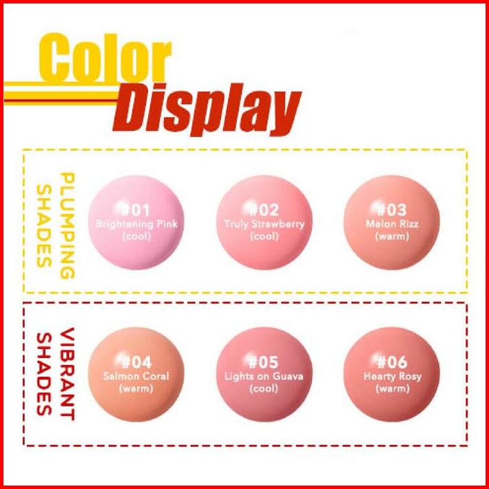 06 HEARTY ROSY, 05 LIGHTS ON GUAVA, 04 SALMON CORAL, 03 MELON RIZZ UP, 02 TRULY STRAWBERRY, 01 BRIGHTENING PINK