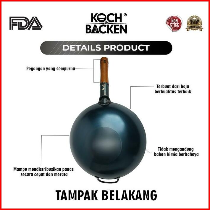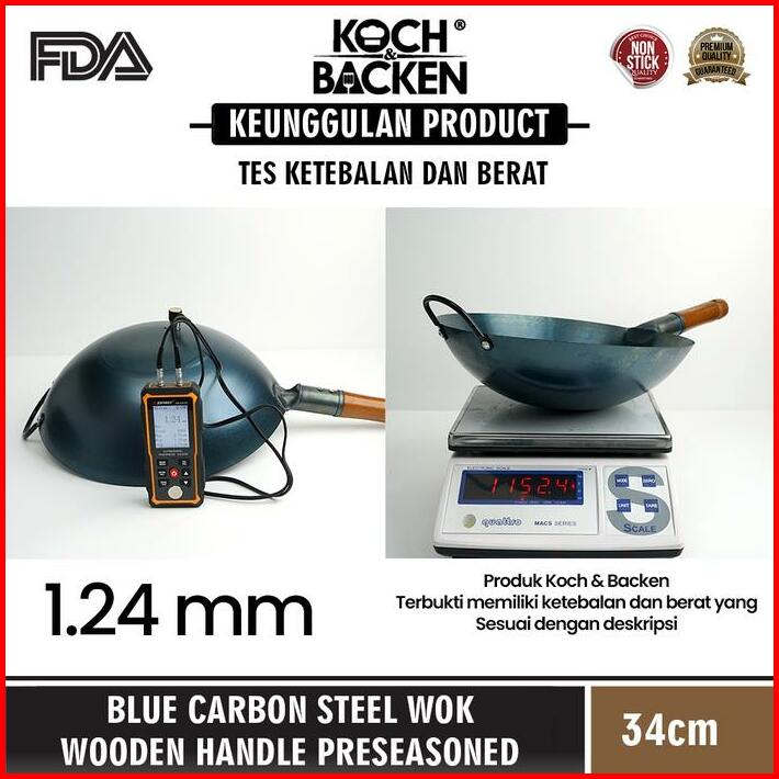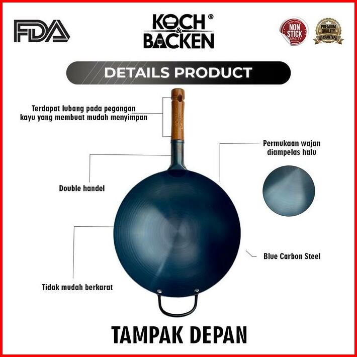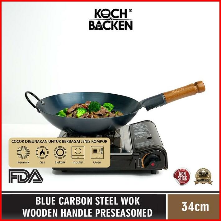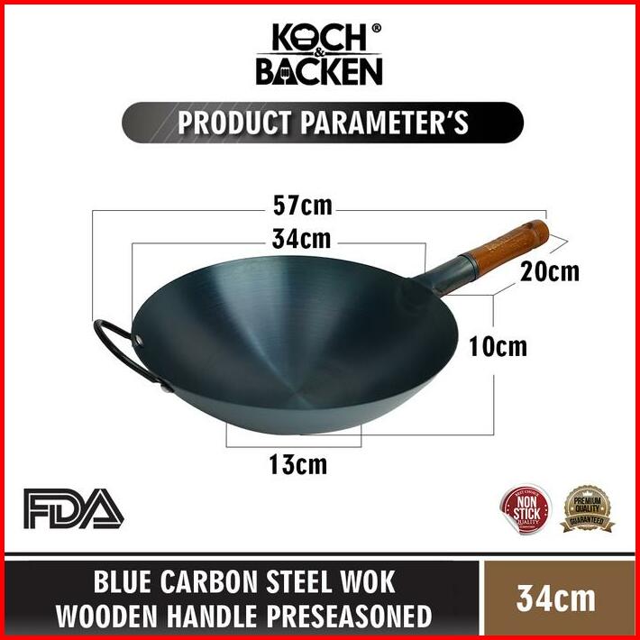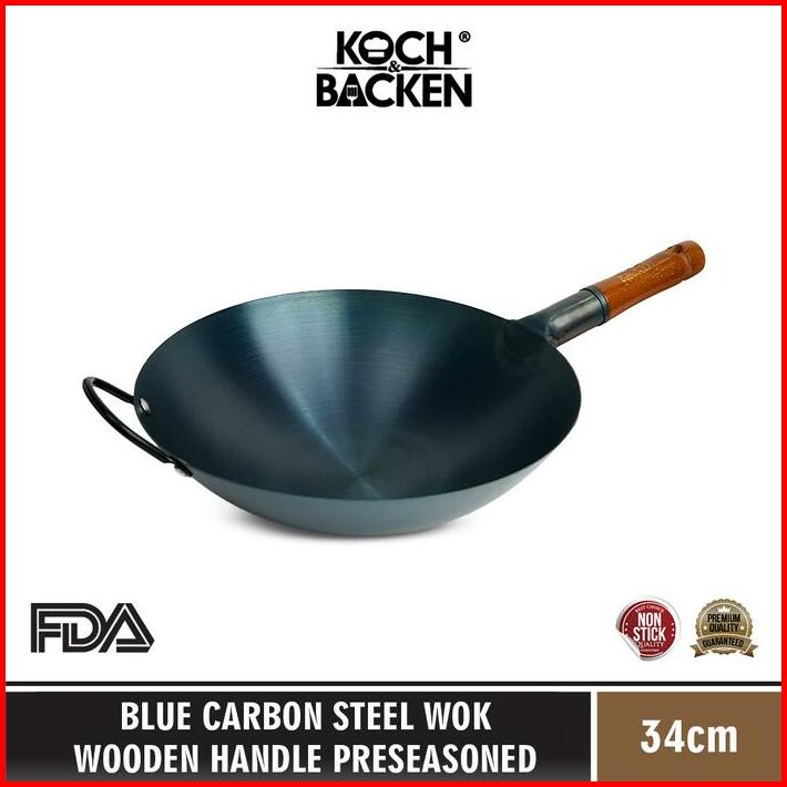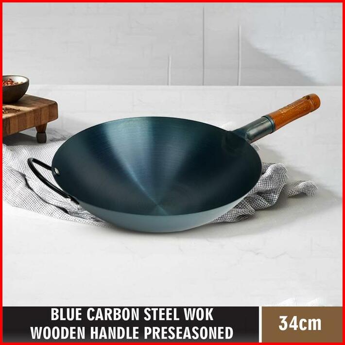 Koch Backen Blue Carbon Steel Wok Wooden Handle Preseasoned 34cm