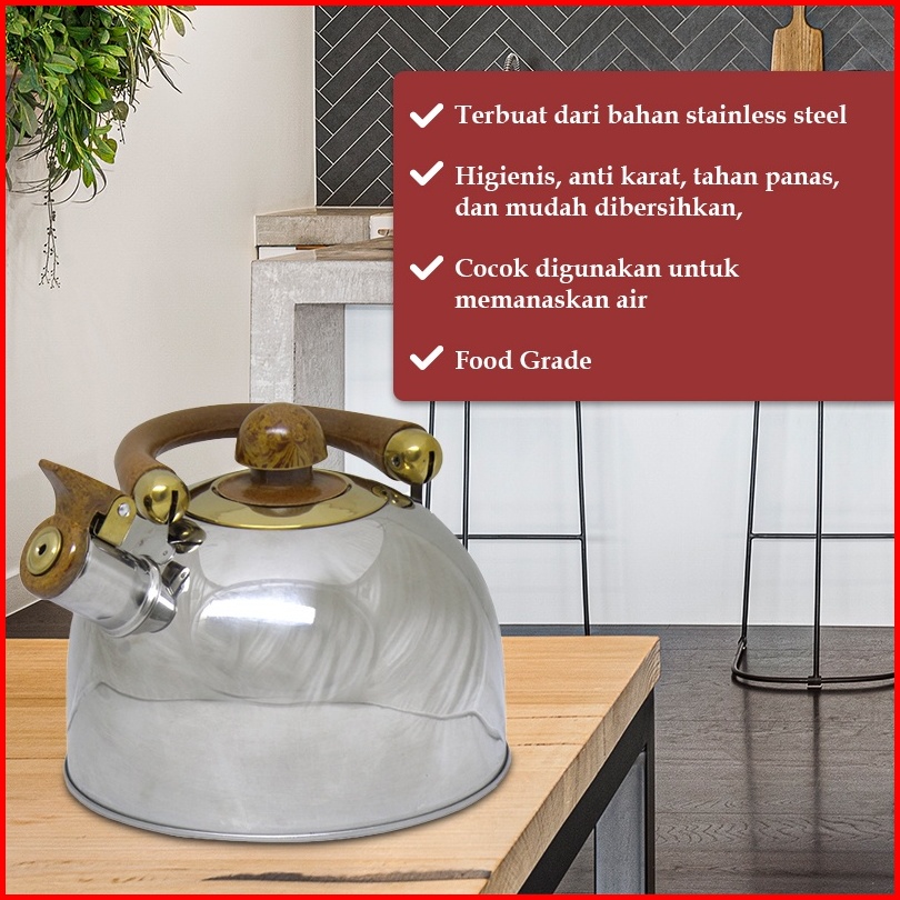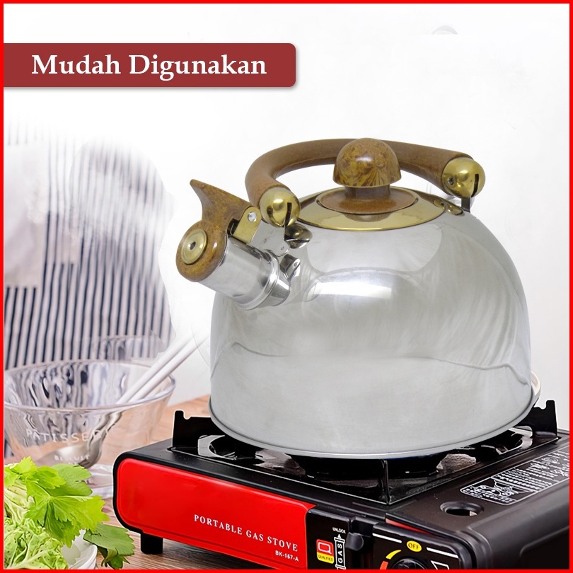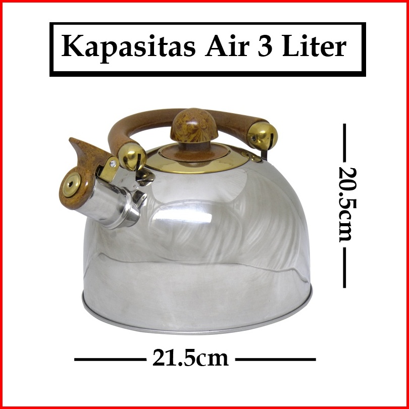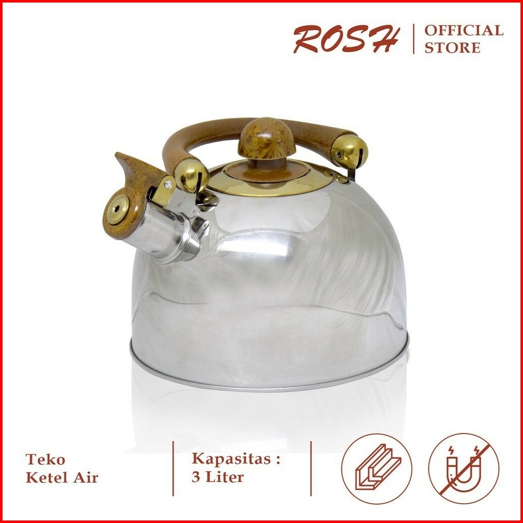 Rosh Teko Ketel Ceret 3 Liter Whistling Kettle Wooden Stainless Steel Anti Karat Ros