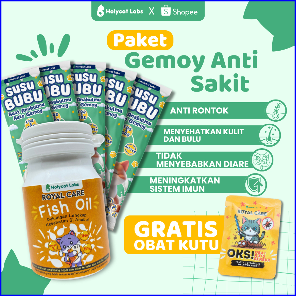 Holycatlabs Paket Kucing Gemoy Anti Sakit Best Seller Susu Bubu 10gr X 5 Pcs Fish Oil 50 Kapsul Gratis Obat Kutu Serbuk