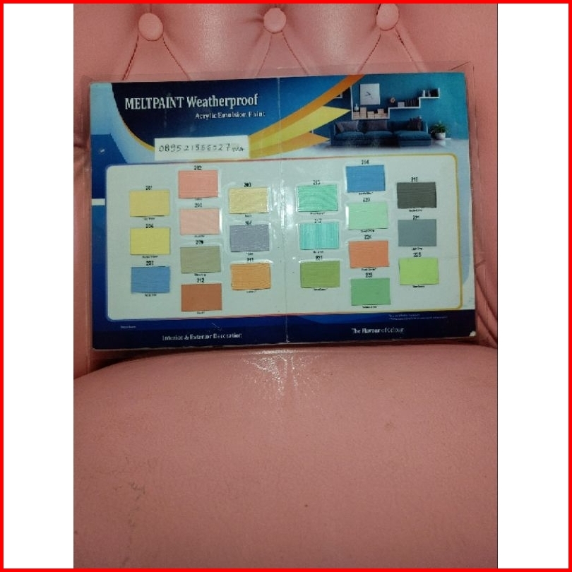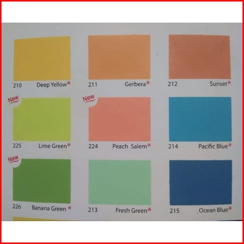 Putih Cerah, Putih biru, Cream203, Cream201, Mocca, Ivory, SilverGrey209, Shinyblue218, Smokedgrey216, LightGrey221, PutihGading, BananaGreen226, IceGreen217, Violet206, Deepyellow210, DurianYellow204, Articblue208, Salem202, Valentine205, Sunset212, Gerbera211, FreshGreen213, SweetGreen220, PeachSalem224, CitrusGreen223, PacificBlue214, Babypink219, LightBlue222, SkyBlue207, LimeGreen225, HITAM