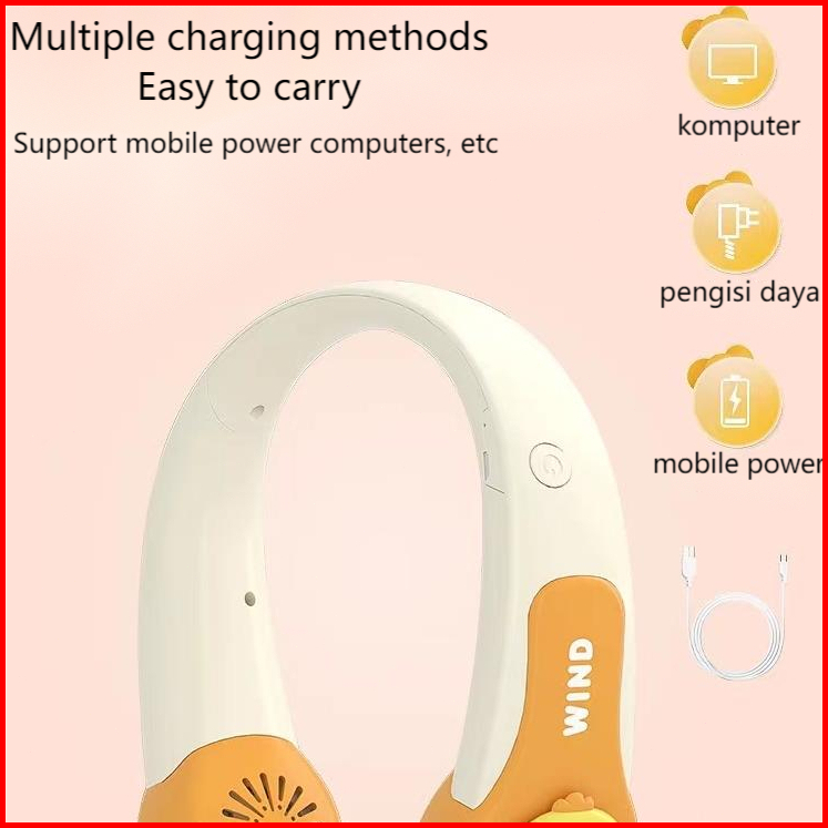 Kipas Angin Leher Gantung Kartun Kipas Portabel Usb Rechargable 3-speed Wind Lucu Anak Kipas Leher Portable Mini Hanging