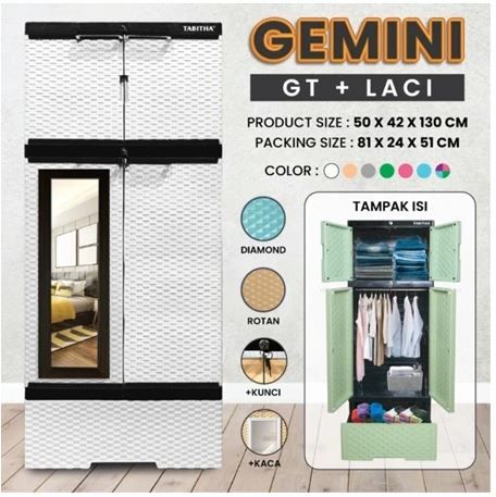 LEMARI PAKAIAN PLASTIK GEMINI GANTUNG KACA KUNCI / FULL RAK DAN LACI