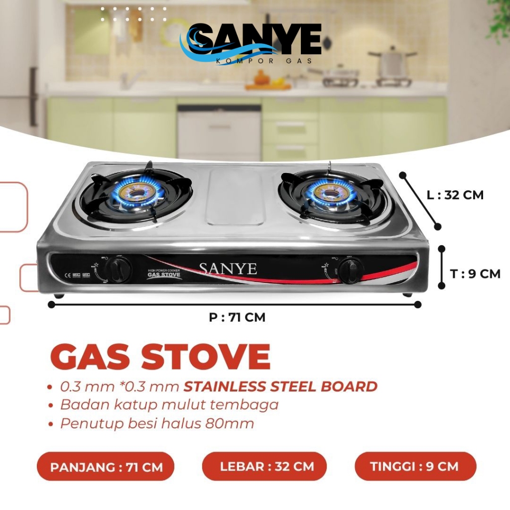 SANYE Kompor Gas Stainless Steel 2 Tungku Silver A08 Sun Burner Api Biru Gas Stove