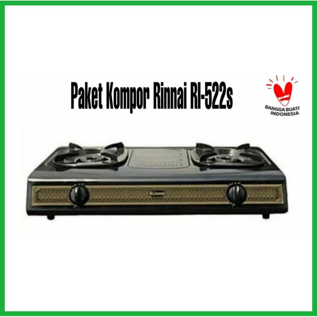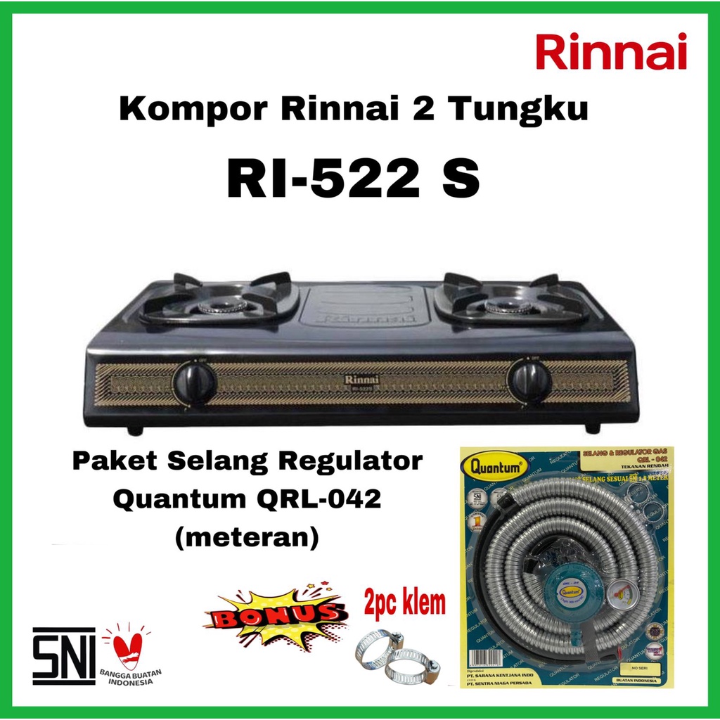 Paket Kompor Gas Rinnai 2 Tungku RI 522S Bonus Selang Regulator Quantum QRL-142/QRL-042