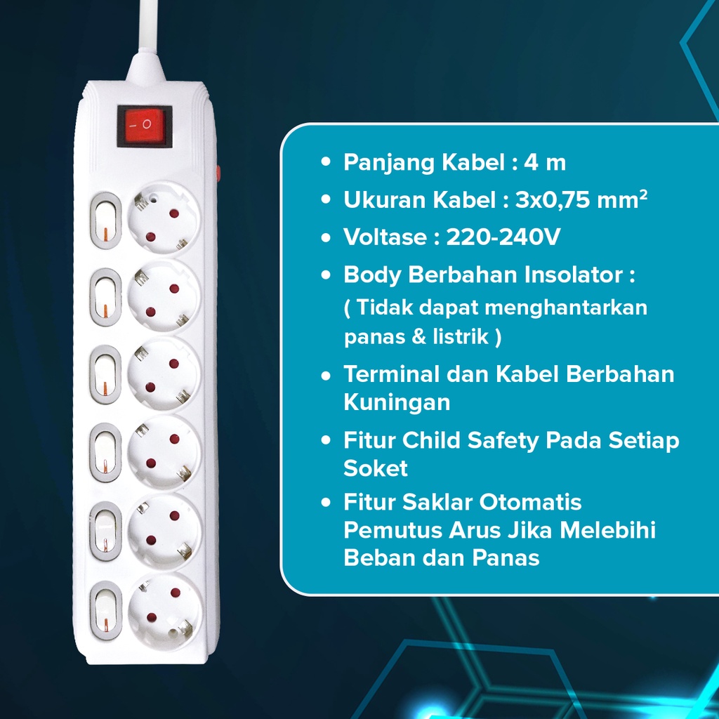 Stop Kontak 6 Lubang Switch Kabel 4 Meter Overheat SNI Kenmaster