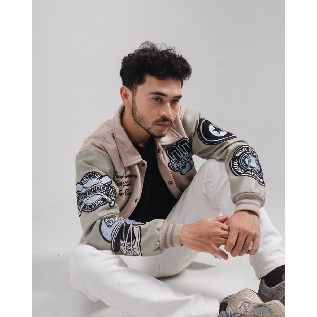 JAKET VARSITY Pria Wanita Never Quit Full Bordir Fleece Kombinasi Kulit Karlit Lengan Panjang M L XL XXL (ORJ-BR009VR)