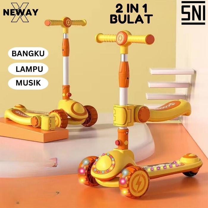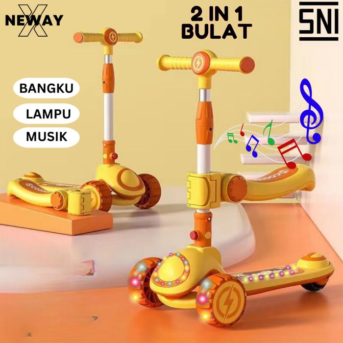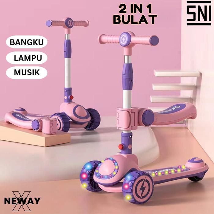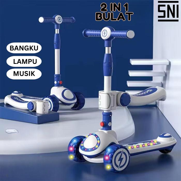 Scooter Mainan Anak 3 tahun Bulat 2 in 1 Skuter Lipat Roda Tiga Otoped Lampu Musik Rem Edukasi Anak Toys