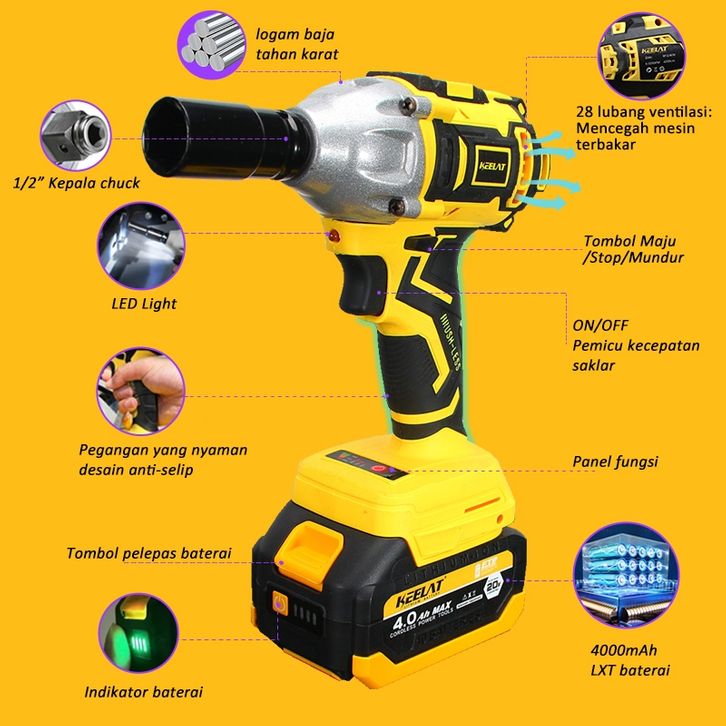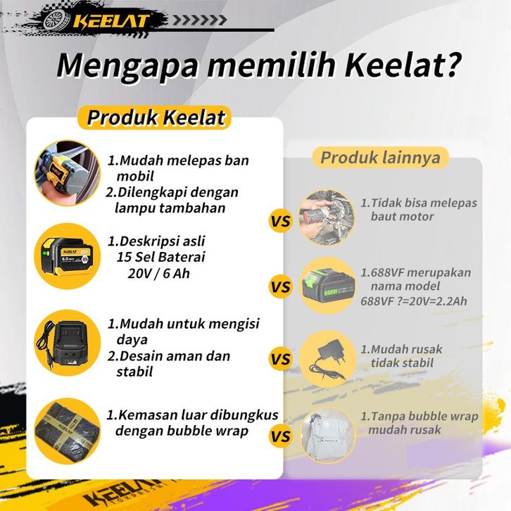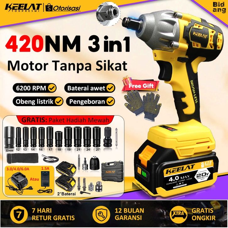 Brushless Impact KEELAT 3 IN 1 Brushless Impact wrench 420NM Cordless MMesin bor Impact baterai Impact 2baterai 13MM imp