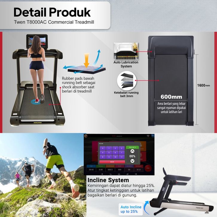 Twen T8000Ac Commercial Treadmill Listrik Treadmil Elektrik Treadmill Motorized Treadmill Multifunction Treadmil Termura