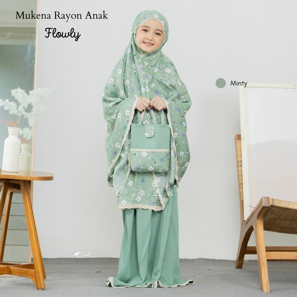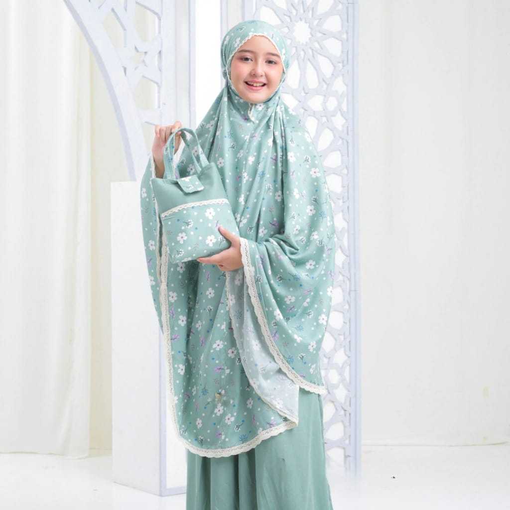 Mukena Anak Tanggung FLOWLY Series Rayon Bali Kombinasi Renda Tas Sleting Mukena Anak Perempuan Motif Cantik