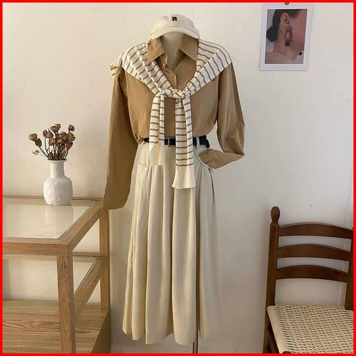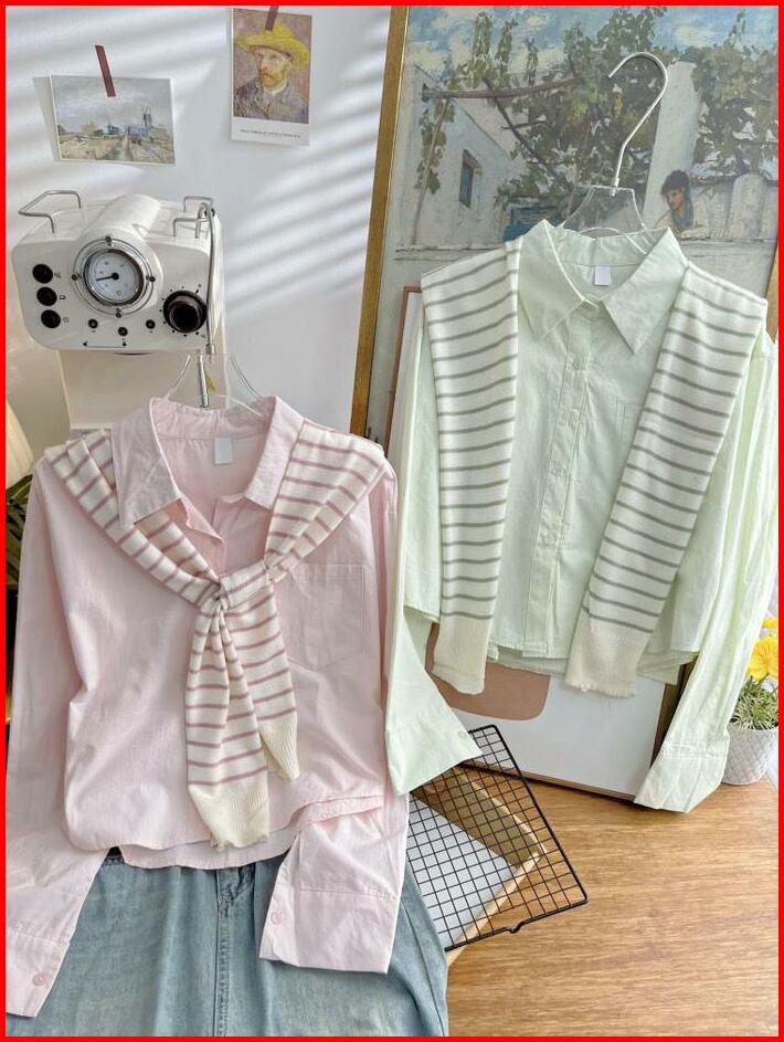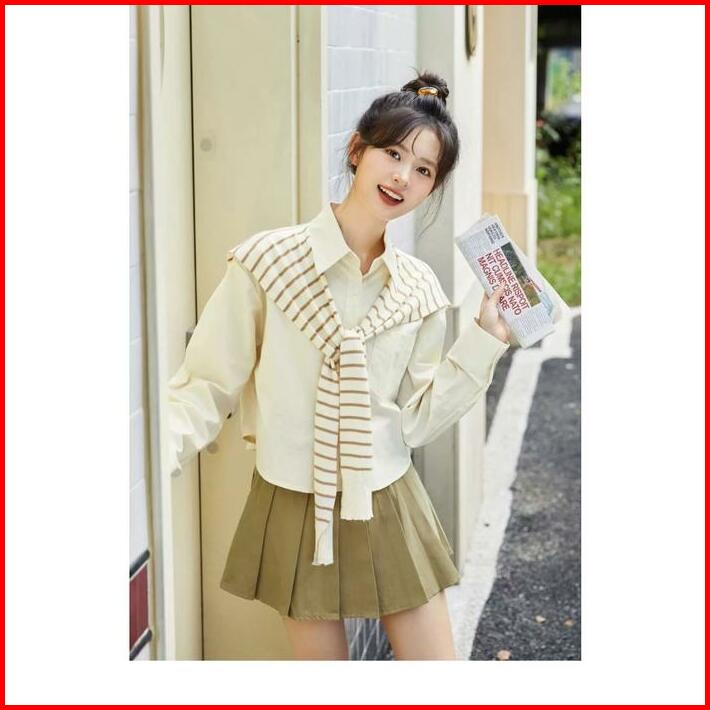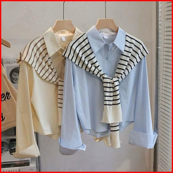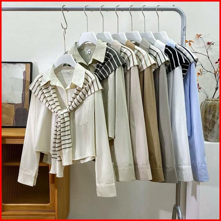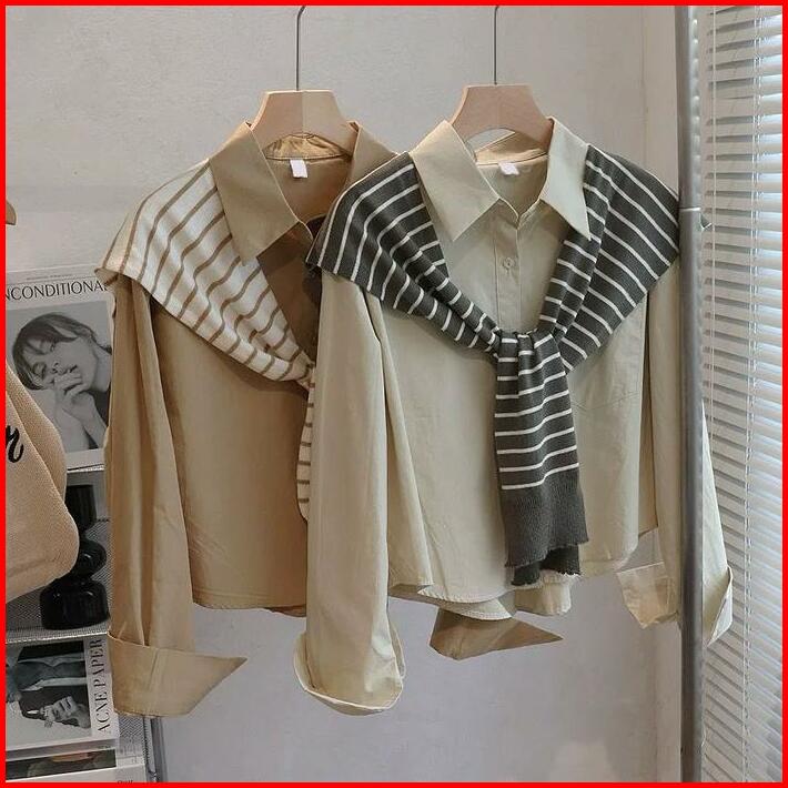 Jlookco Kemeja Lengan Panjang Wanita Korean Style Atasan Baju Motif Salur