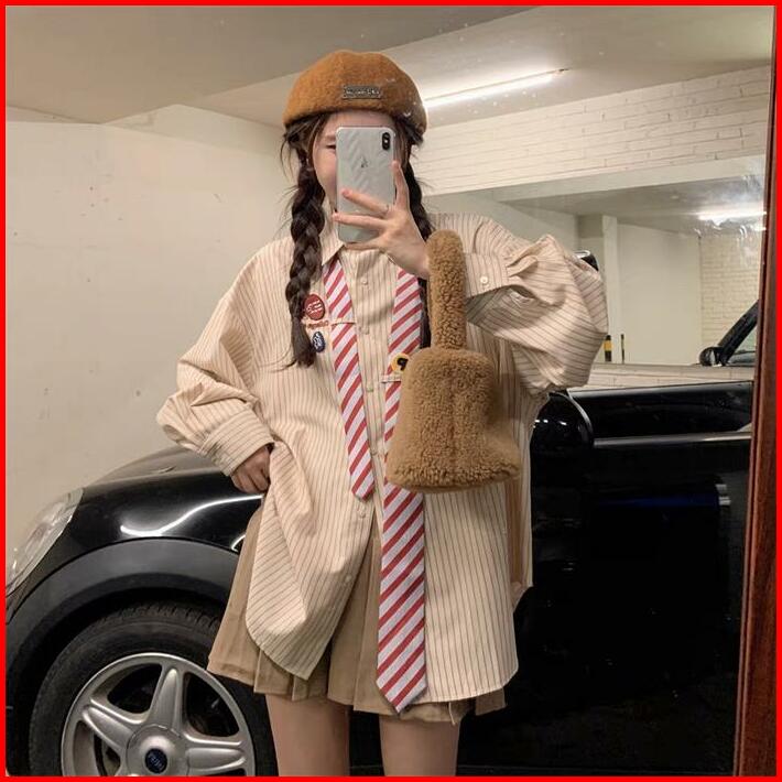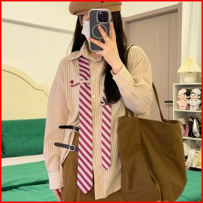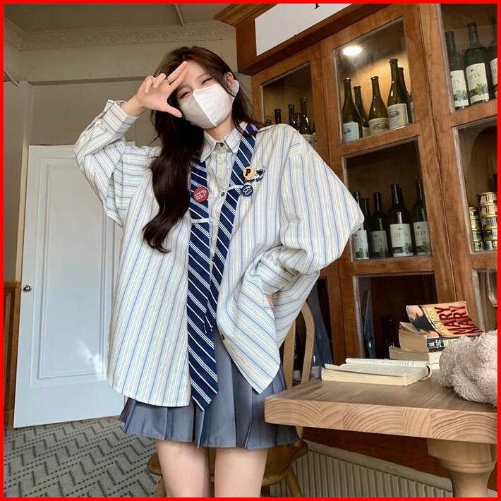 M-4xl Kemeja Wanita Garis-garis Amerika Antik Baru Serbaguna Fashion Chic Atasan Biru Coklat Kerah Panjang Retro Linen H