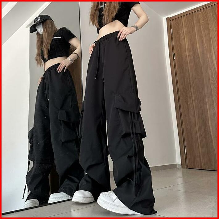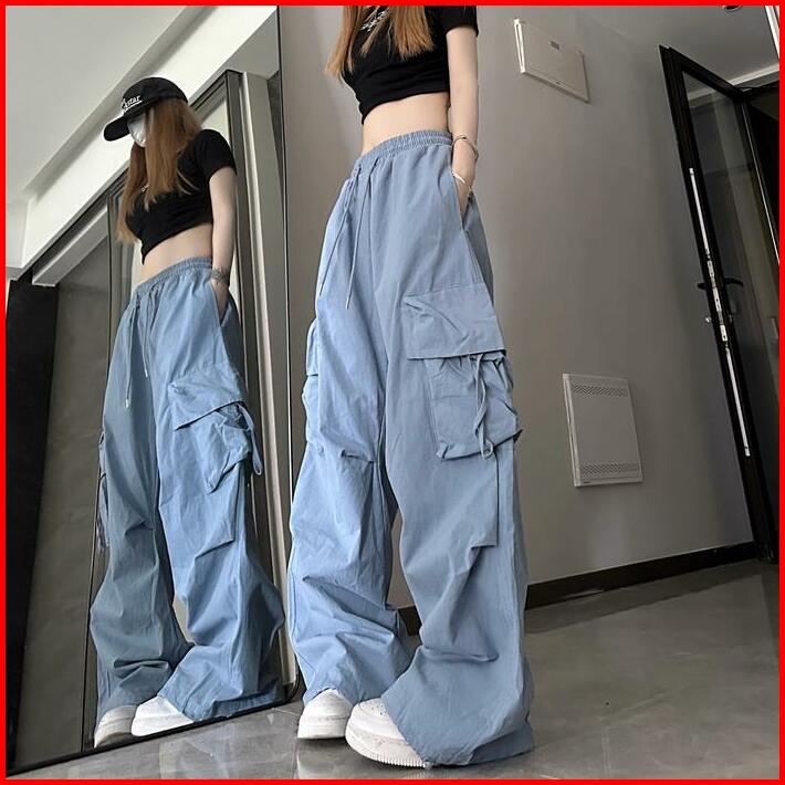 Gdtima Baggy Pants Wanita Elastic Highwaist Celana Cargo Panjang Celana Oversize Loose