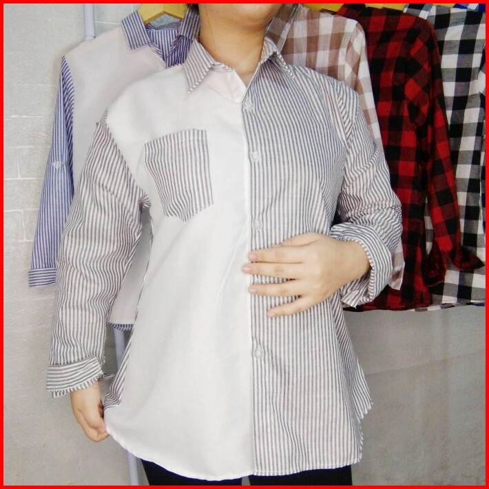 Kemeja Wanita Katun Salur Kombinasi Putih Fit To Size Xl Xxl