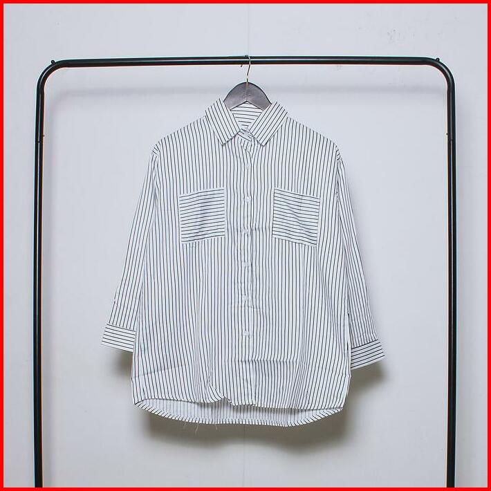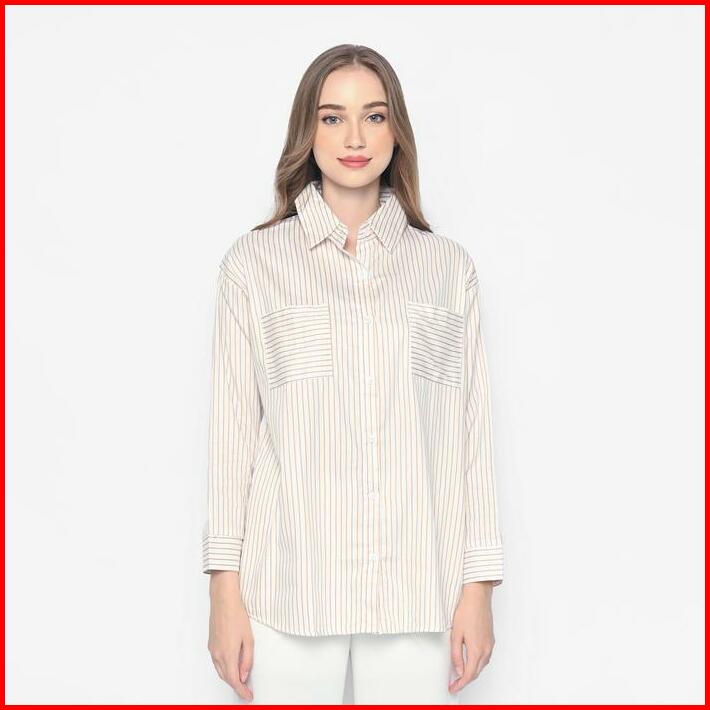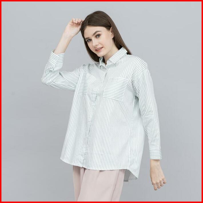 Queentin Kemeja Casual Wanita 0102 Katun Salur Lengan Panjang Atasan Formal Garis