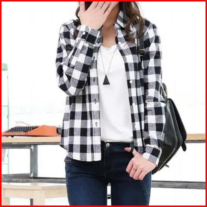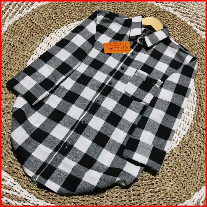 Baju Kemeja Flanel Kotak Catur Hitam Putih Pria Wanita V-neck Distro Motif Cowok Panjang Katun Casual Dewasa