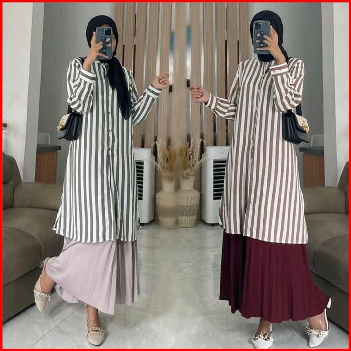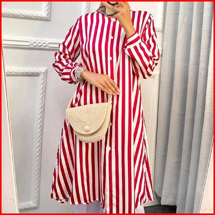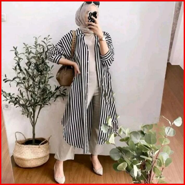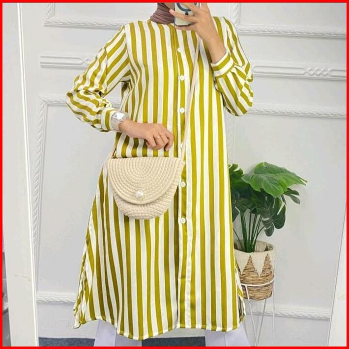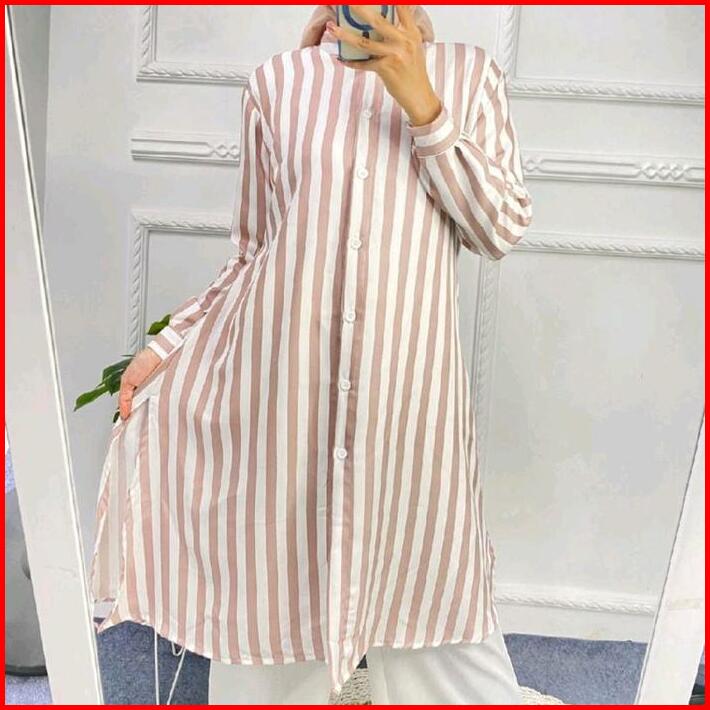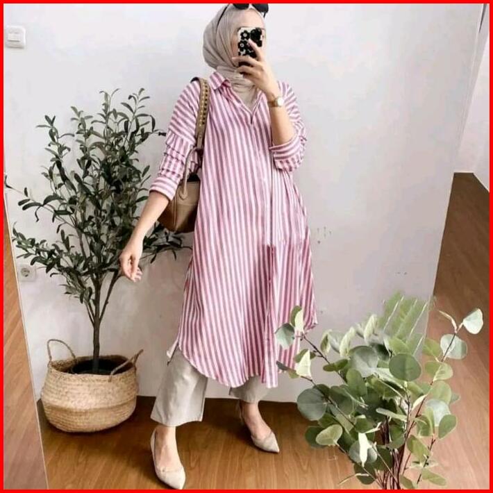 Tunik Kemeja Wanita Lengan Panjang Bahan Rayon Premium Adem Nyaman Motif Salur Stripy Cantik By Azka Collection