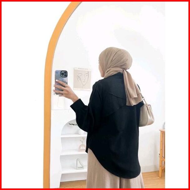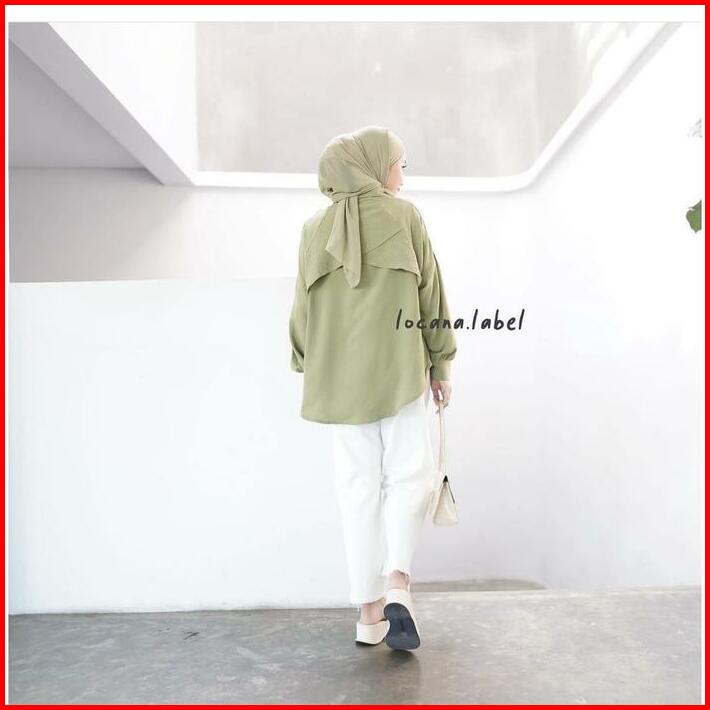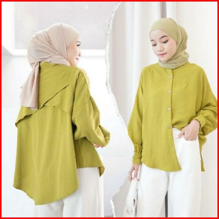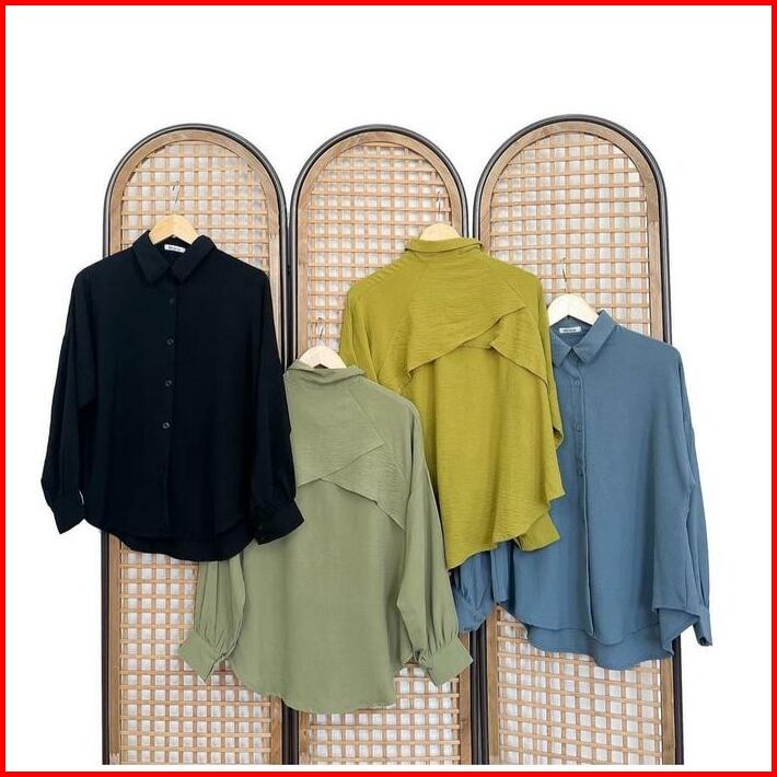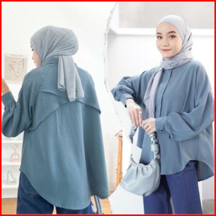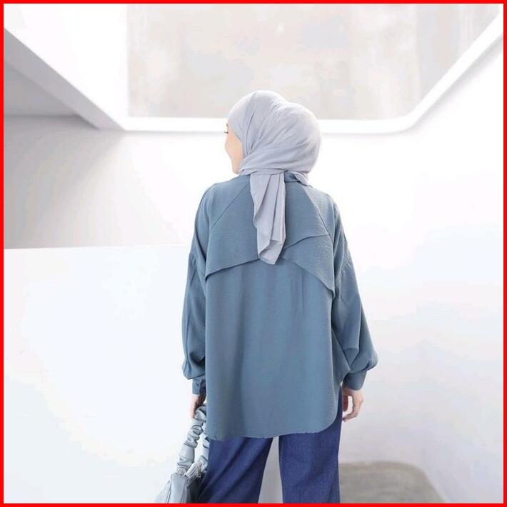 Luna Blouse Kemeja Cringkle Ootd Baju Atasan Wanita Oversize Terbaru Lengan Balon Ruffle Belakang Biru Crinkle Hitam Kan