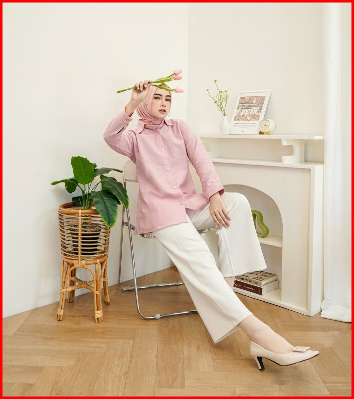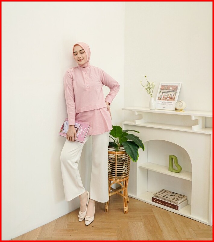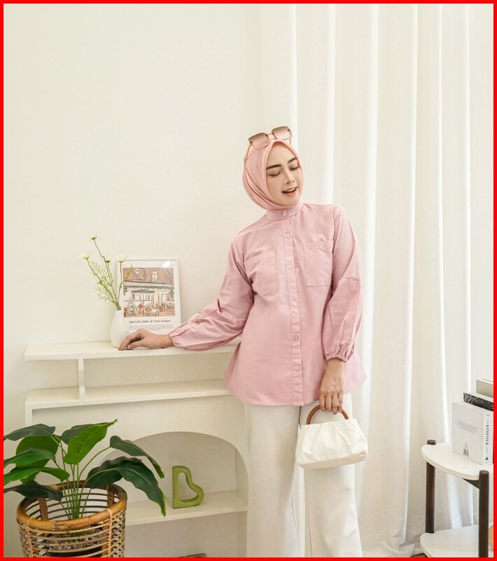 Baju Atasan Kemeja Blouse Wanita Hijab Pink Linen All Size