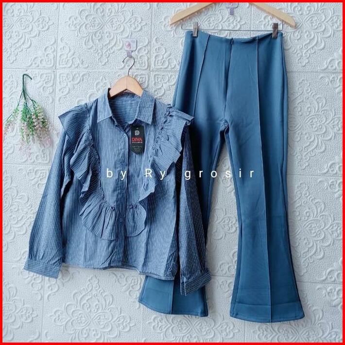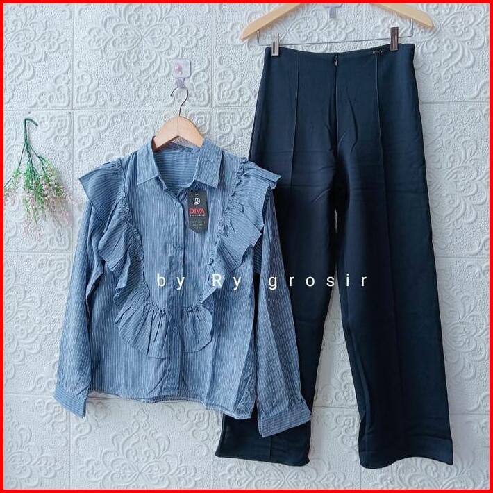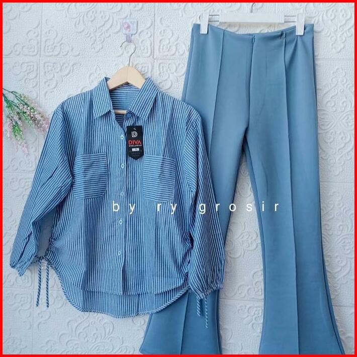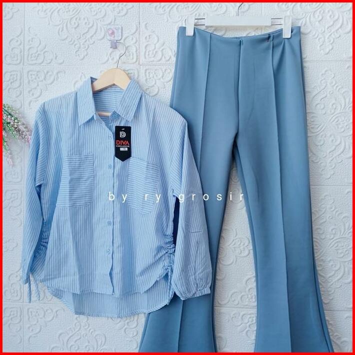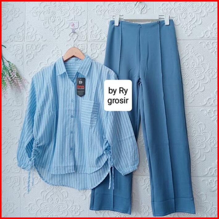 Setelan Wanita Ema Kemeja Salur Celana Kulot Dan Cutbray Scuba Panjang