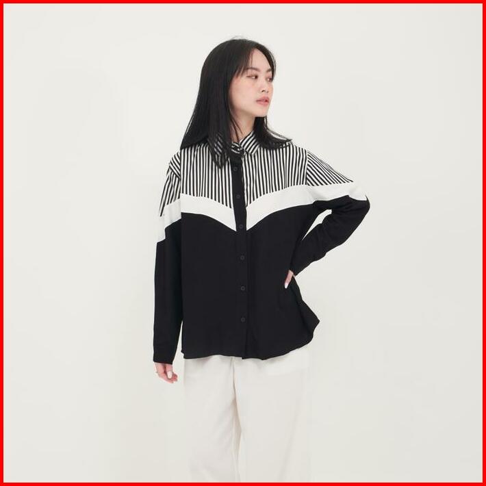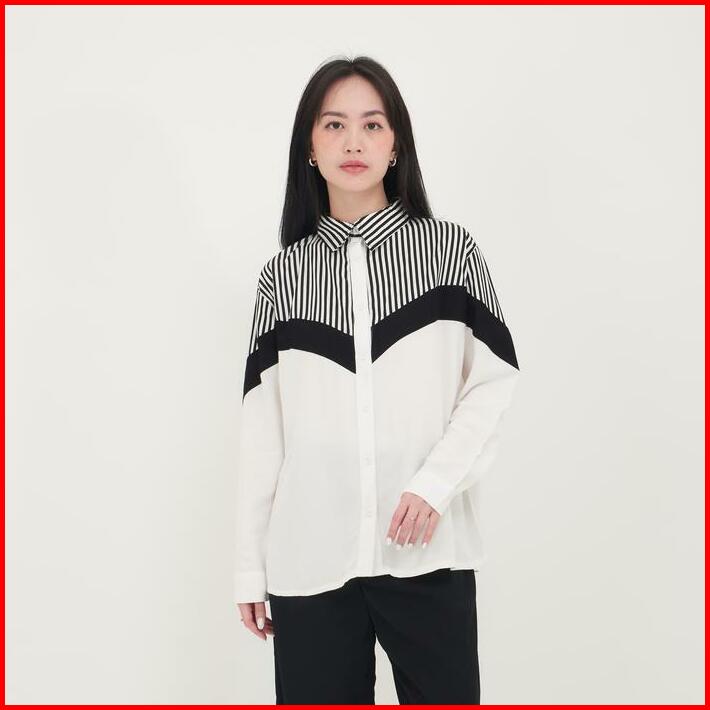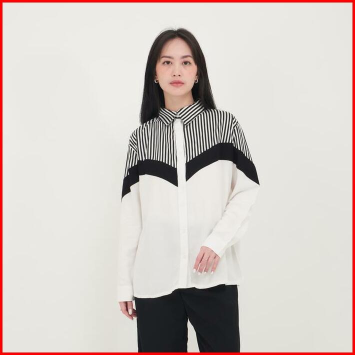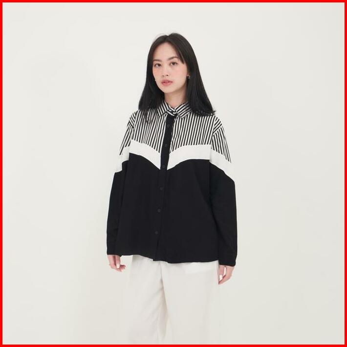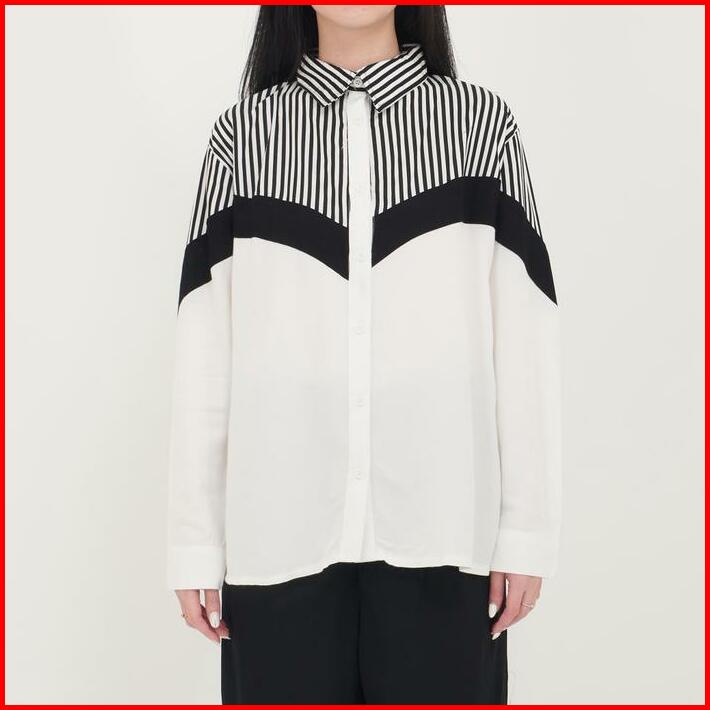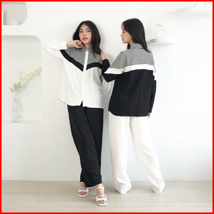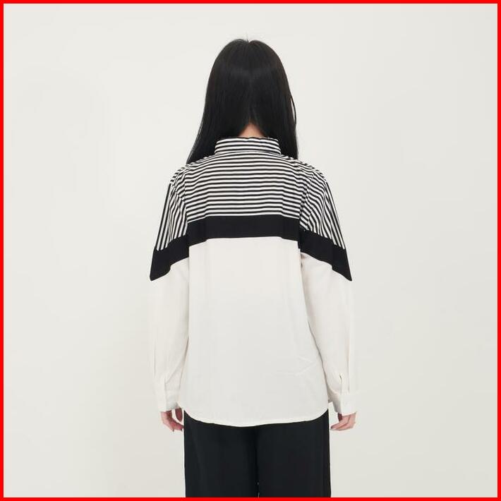 Queentin Kemeja Kombinasi Wanita 0751 Katun Rayon Premium Polos Mix Salur Lengan Panjang Casual Simple