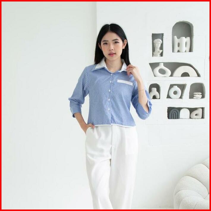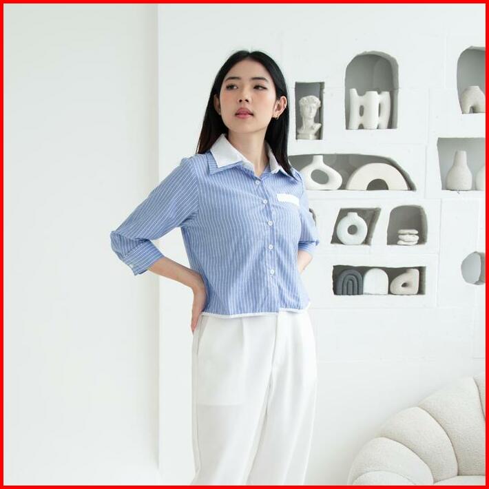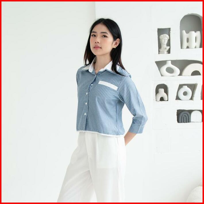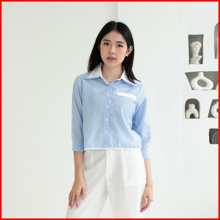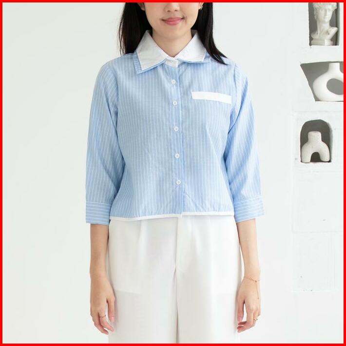 Queentin Kemeja Wanita Crop 0659 Katun Polymicro Motif Salur Lengan Panjang 3 4 Baju Casual Dan Kerja