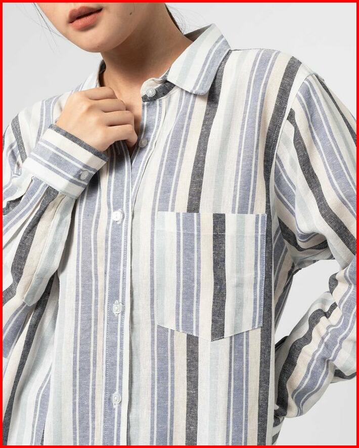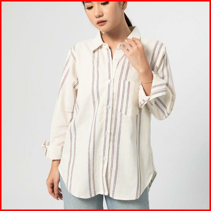 Malova Ermila Shirt Kemeja Stripe Wanita Linen Lengan Panjang Salur Baju Casual Kemeja Cewek