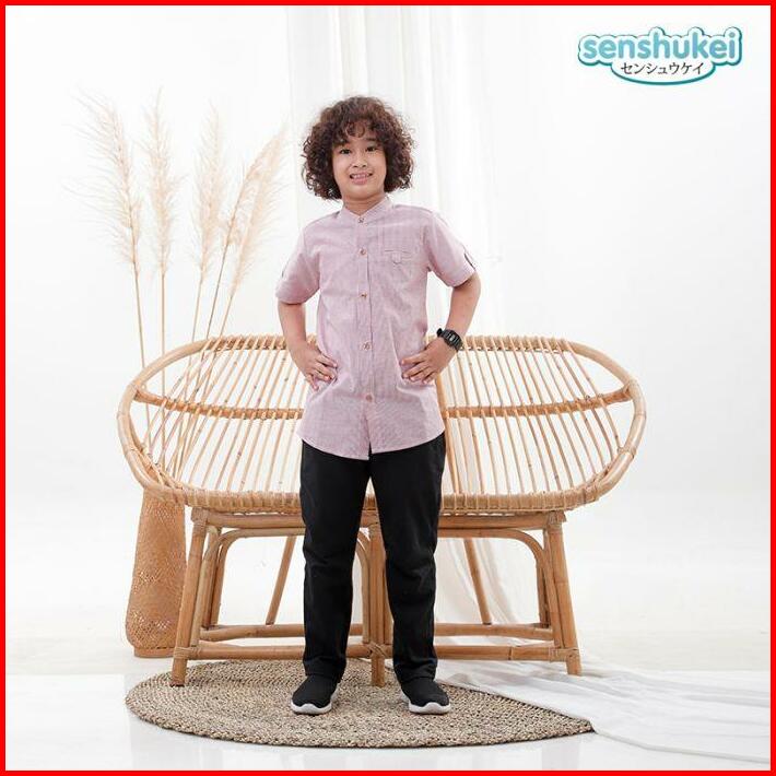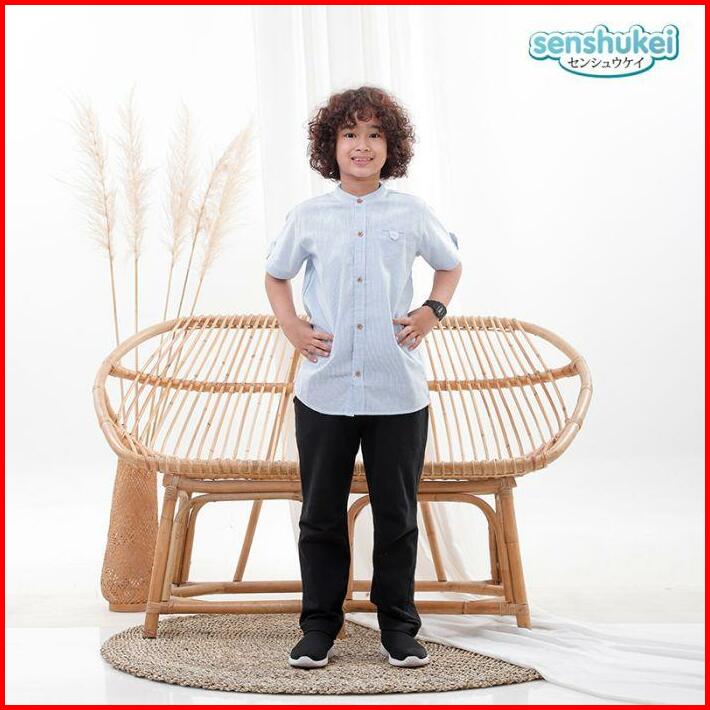 Kemeja Koko Motif Salur Anak Atasan Lengan Pendek Katun Muslim Baju Biru