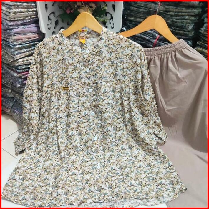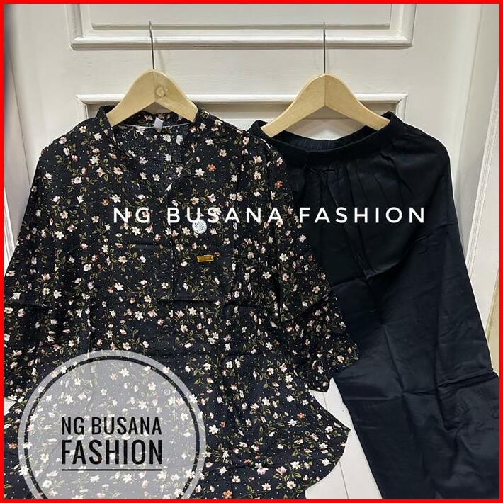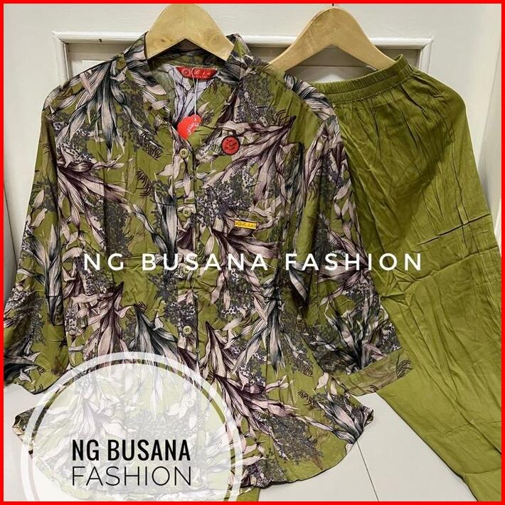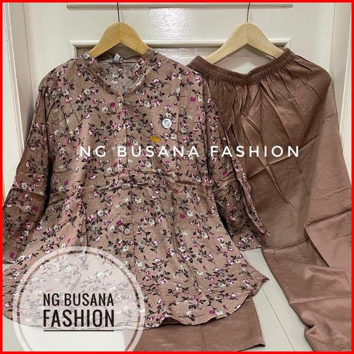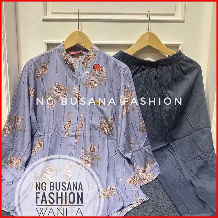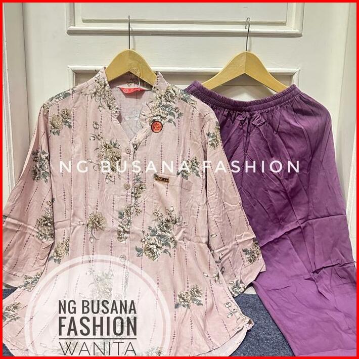 One Set Wanita Bahan Rayon Premium Motif Bunga Kotak Salur Setelan Kekinian Ukuran Jumbo Baju Model Kemeja Kancing Celan