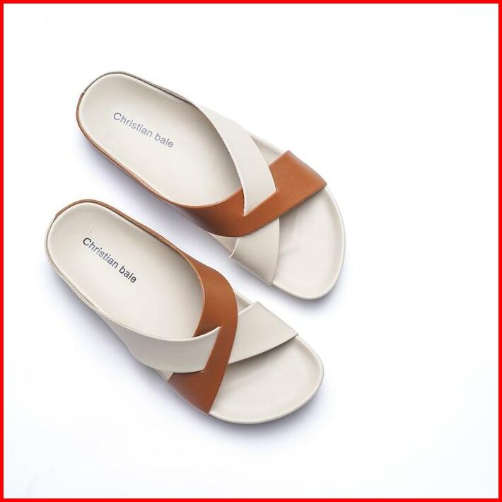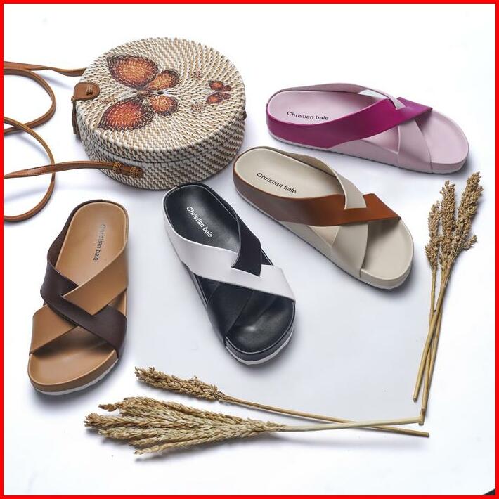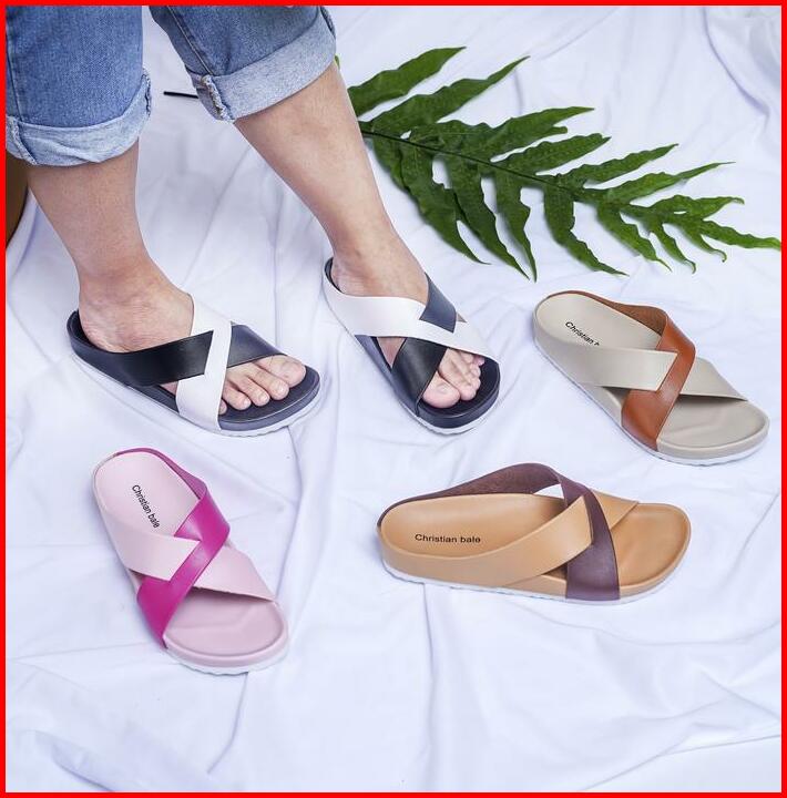 Sandal Christian Bale Model Kaila Sandal Kulit Flat Wanita Ban Dua Sandal Kasual Karet Premium Original