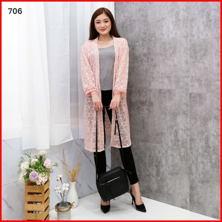Cardigan Brukat Lace Panjang Putih Brocade Import Outer Pantai Cantik