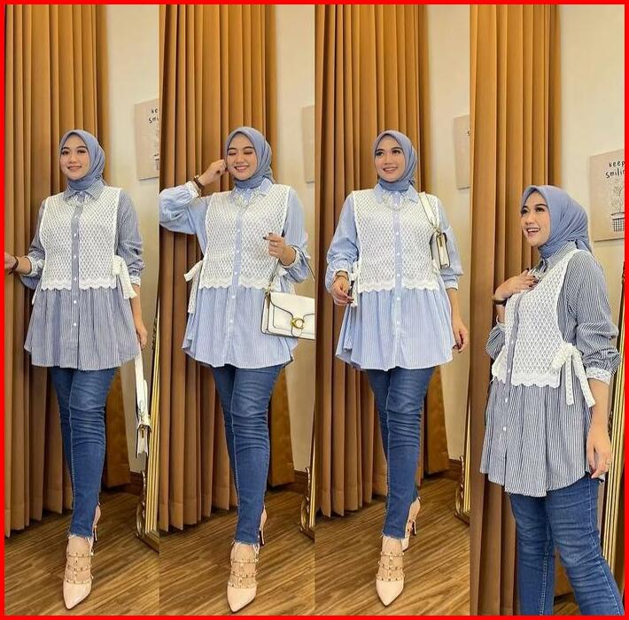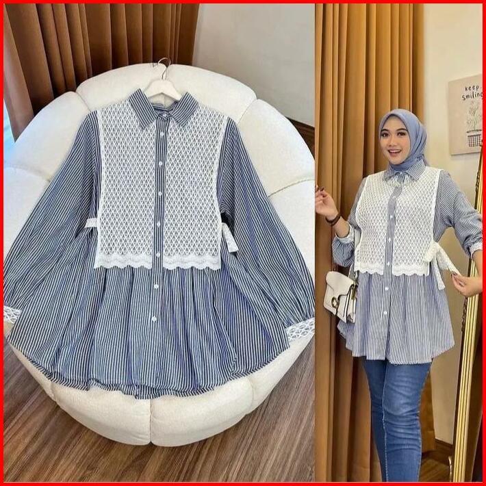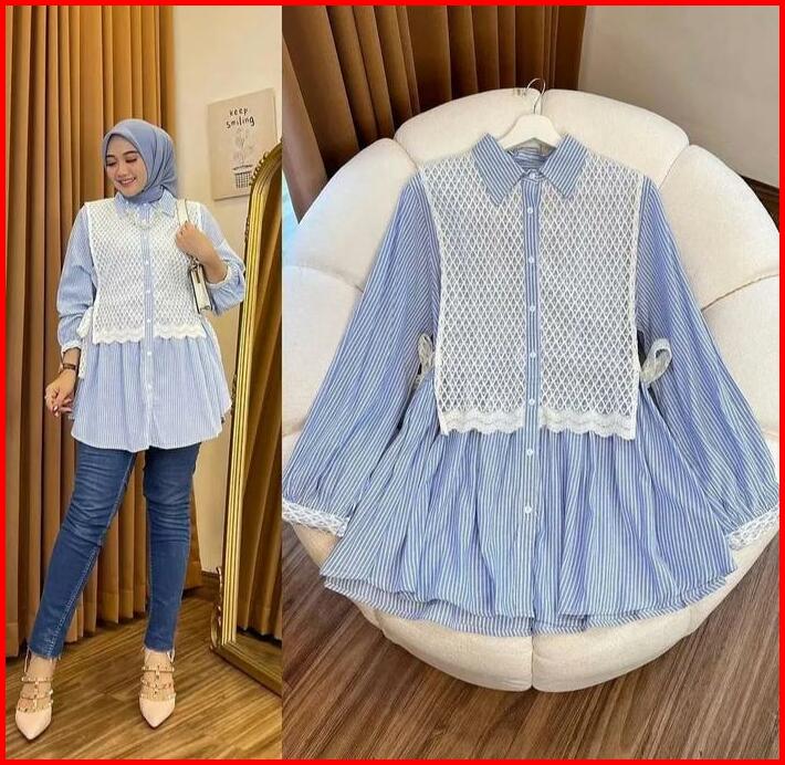 Atasan Kemeja Wanita Model Terbaru Aruni Blouse Salur Kombinasi Brukat Premium