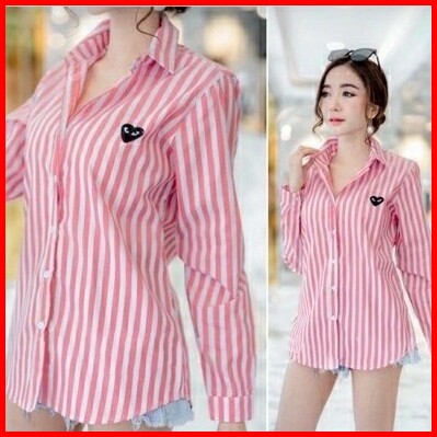Kemeja Wanita Lengan Panjang Xl Salur Pink Muda Peach Garcon Serra