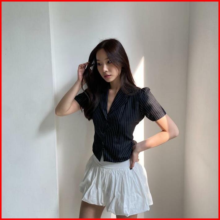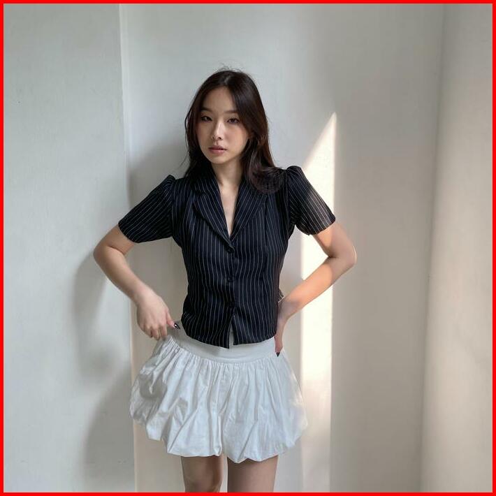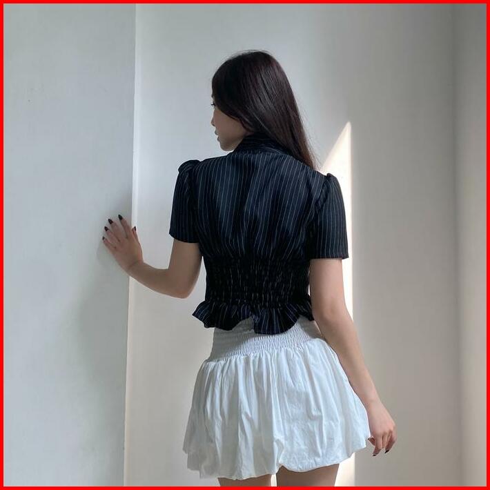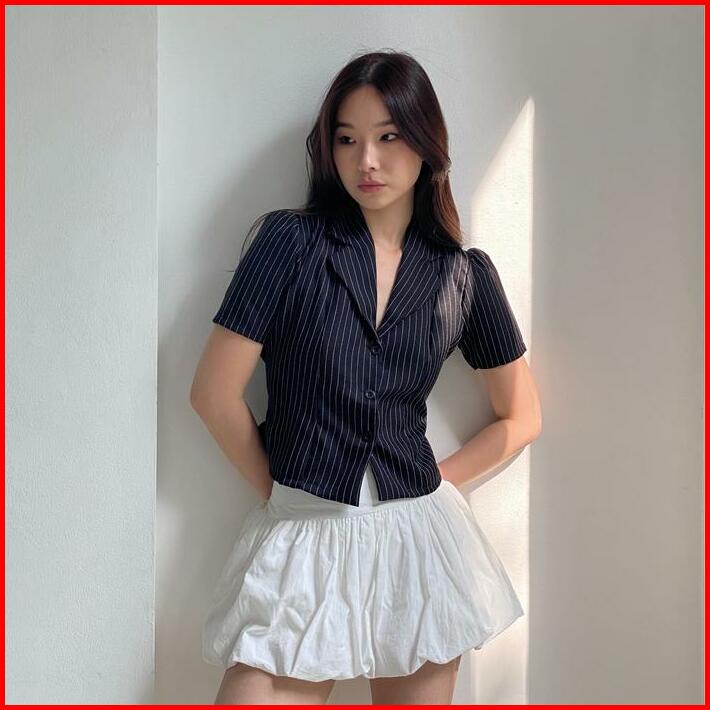 Oxford Shirt Nyre The Label Kemeja Wanita Hitam Pendek Stretch Fit Stripe Karet Casual Simple Kerah Midi