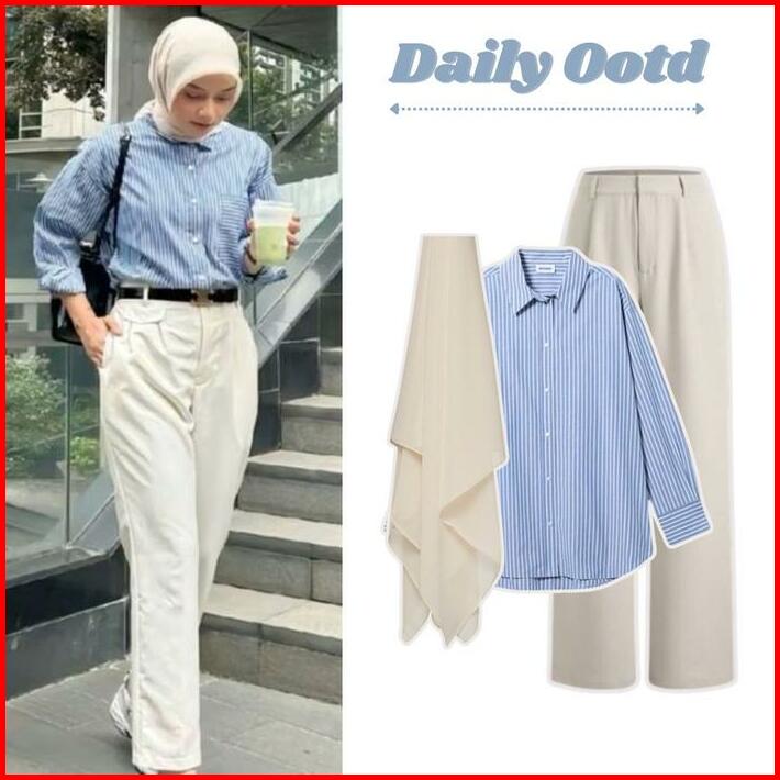 Setelan Daily Ootd 3in1 Kemeja Saluria Wanita Hijab Bella Square Celana Jennie Knit Ivory Bs26