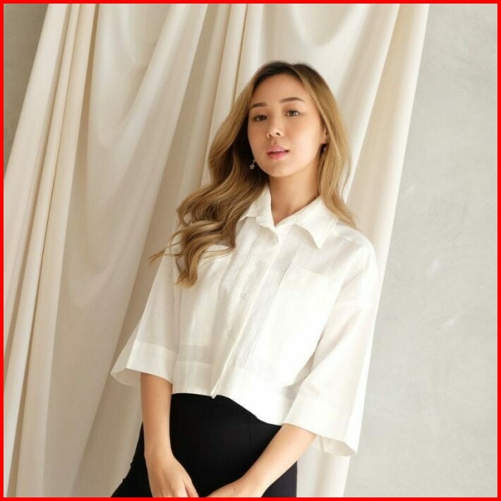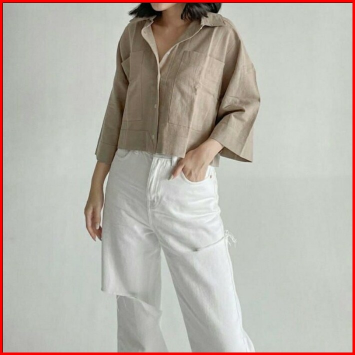 Atasan Wanita Kemeja Kerja Outer Crop Linen Pocket