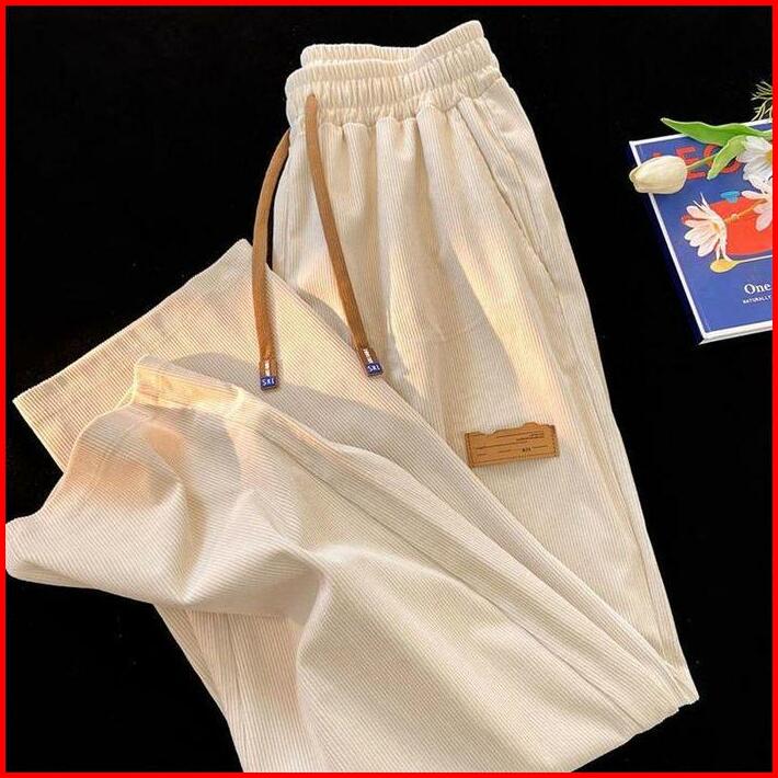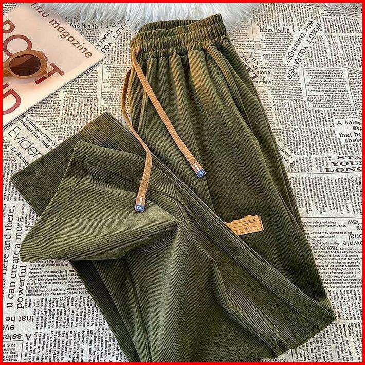 Gdtima Celana Wanita Corduroy Elastis High Waist Baggy Straight Pants