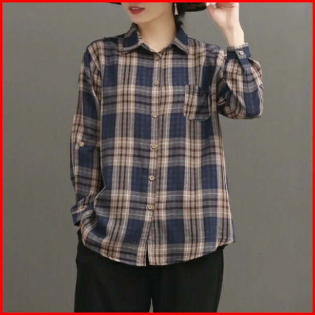Magie Double Cloth Plaid Top Import Atasan Kemeja Kotak Linen Wanita