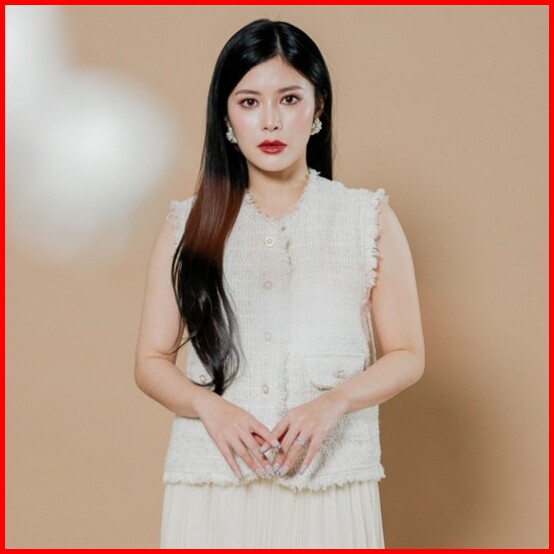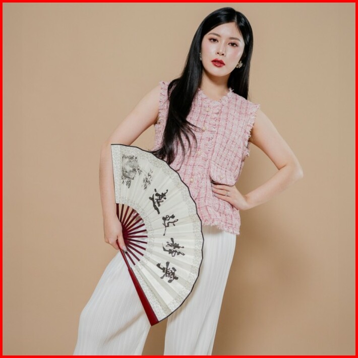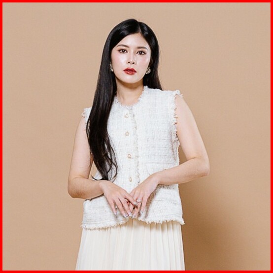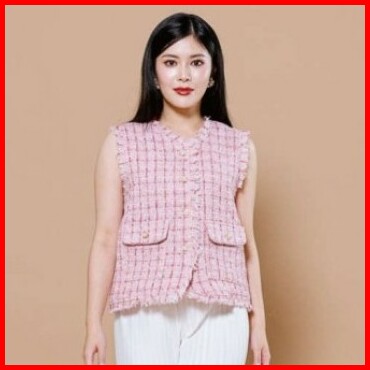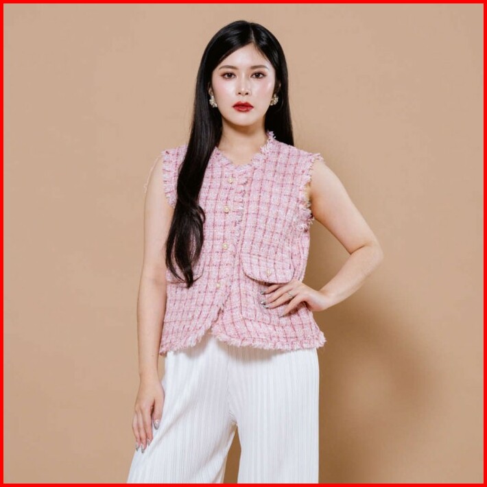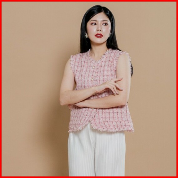 This Is April Atasan Tweed Vest Blouse Wanita Elegan Tanpa Lengan Cny Fortune Top Pink White