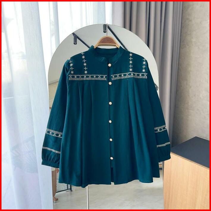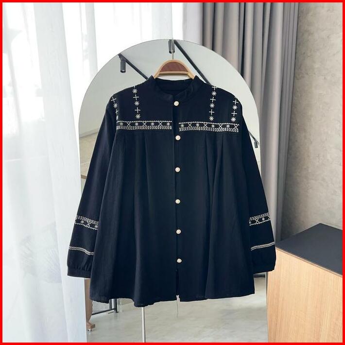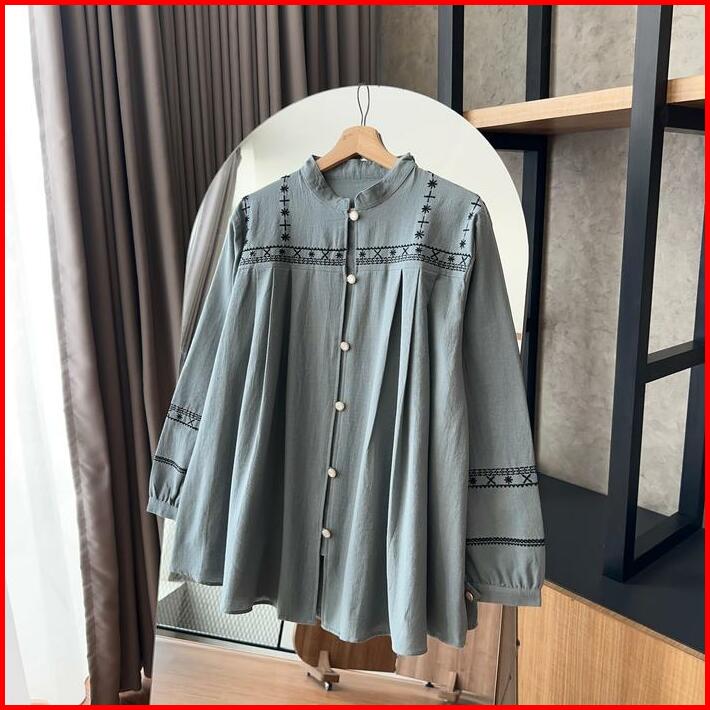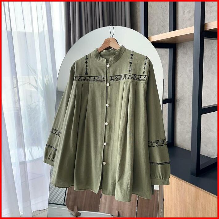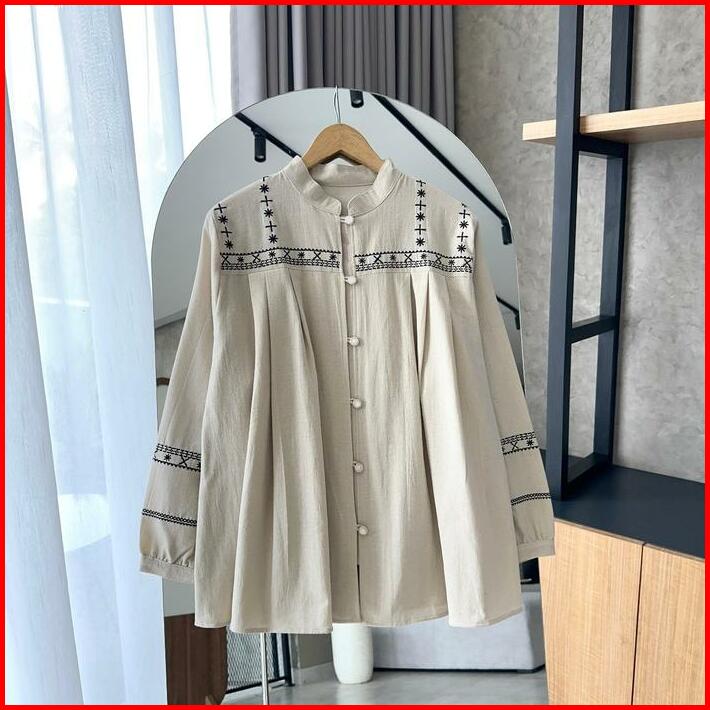 By.hana 189 Kemeja Kerah Shanghai Polos Bordir Atasan Panjang Wanita Variasi Kain Linen Viral