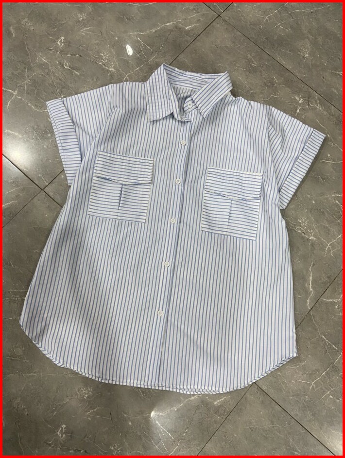 Kemeja Casual Wanita Katun Jepang Salur Lengan Pendek Blouse Blus Atasan Wanita Ld 104 Bahan Katun