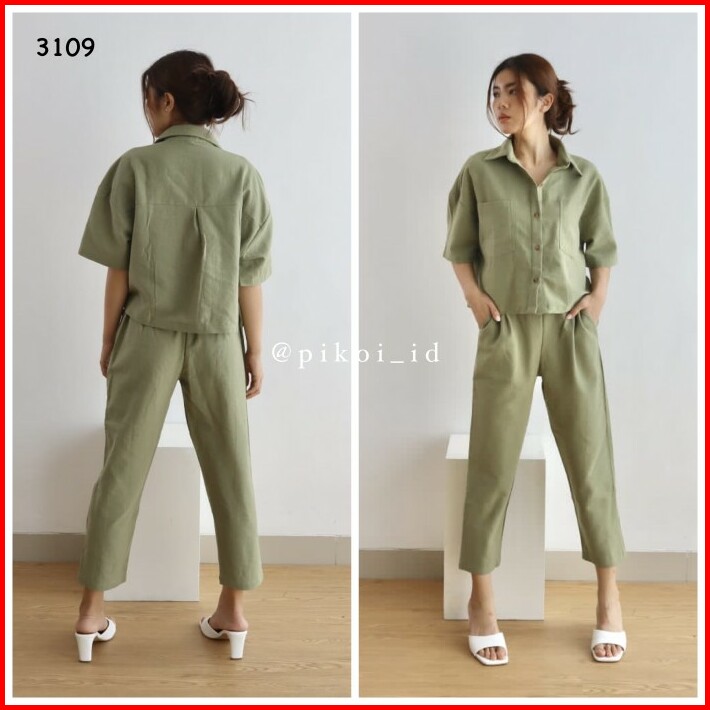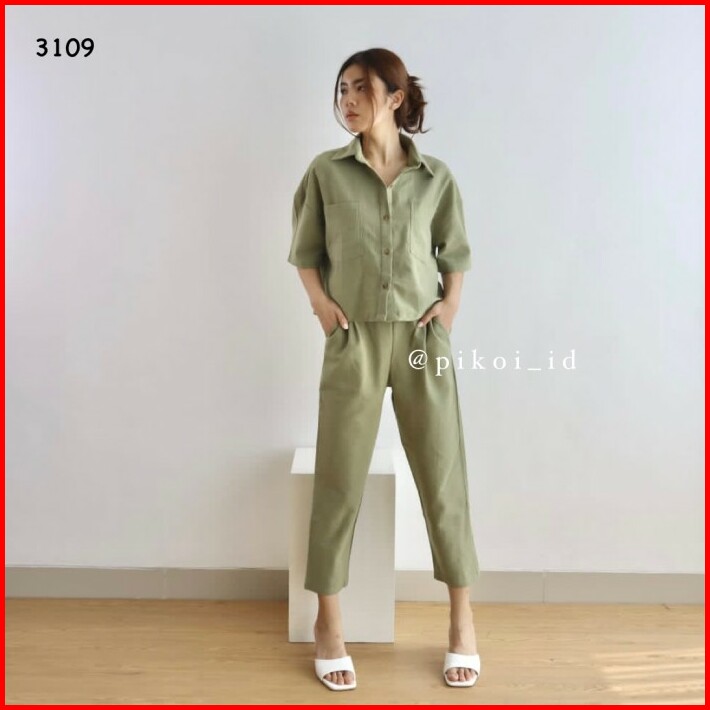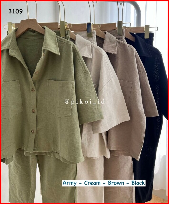Setelan Wanita Celana Panjang Hitam Set Katun Linen Kemeja Polos Oke