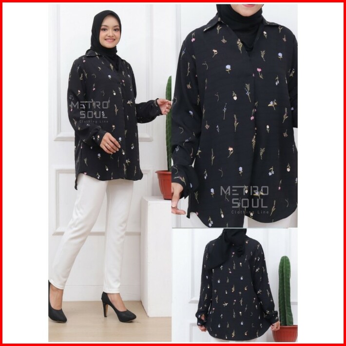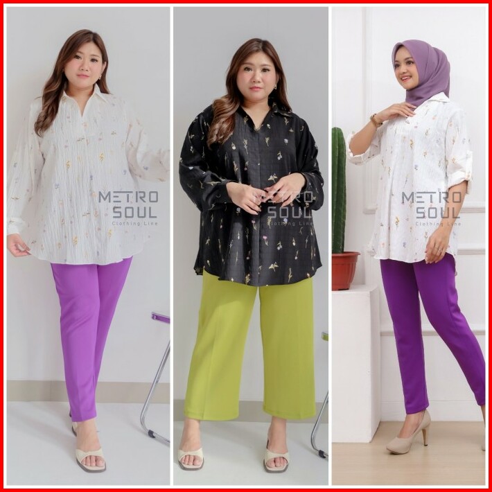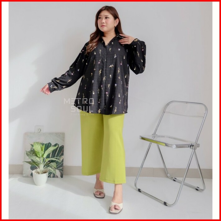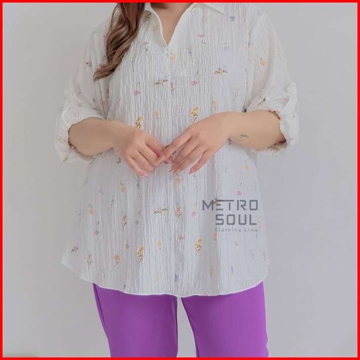 Kemeja V Atasan Wanita Basic Shirt Crinkle Bunga Salur Standar Jumbo