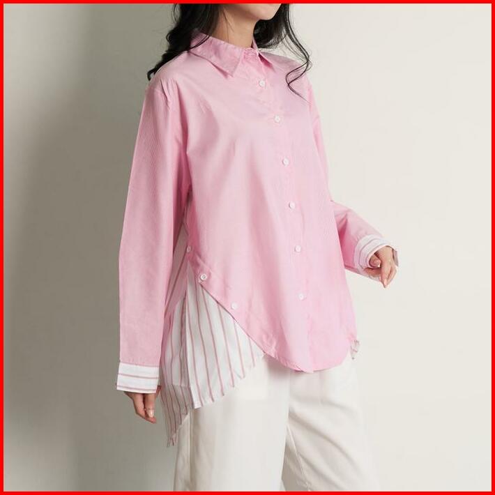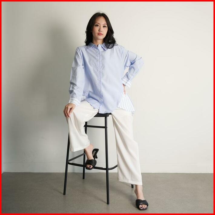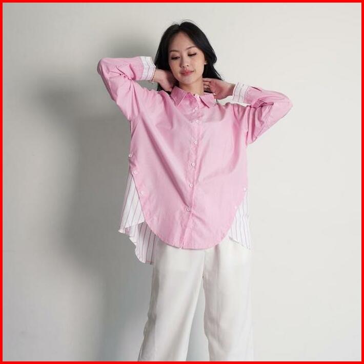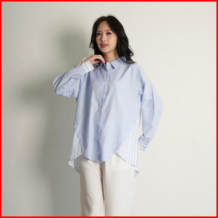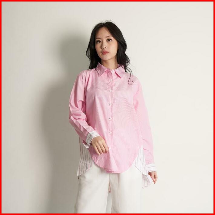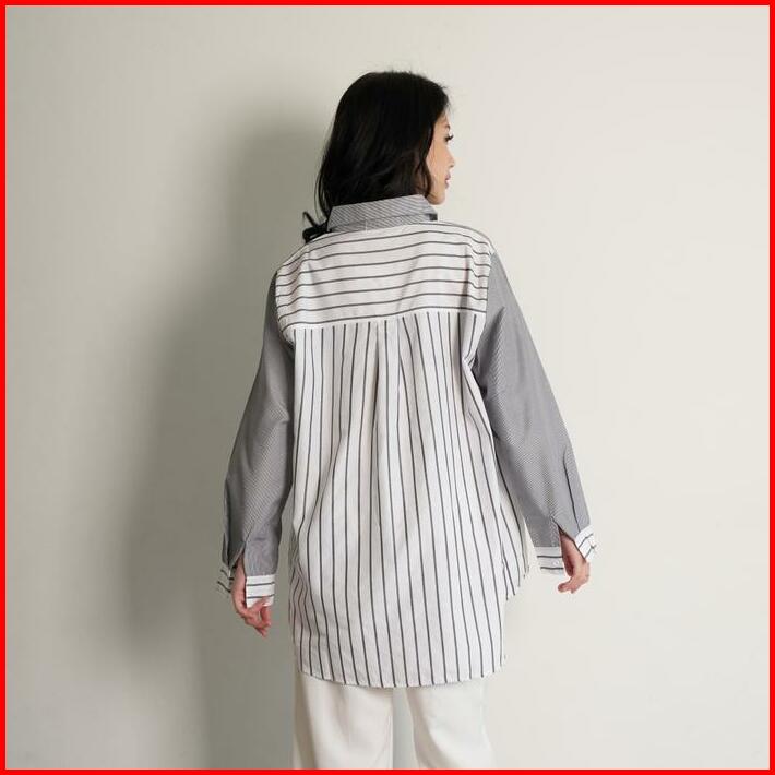 Queentin Kemeja Wanita Kombinasi 0586 Katun Polymicro Motif Salur Lengan Panjang Casual