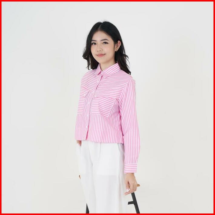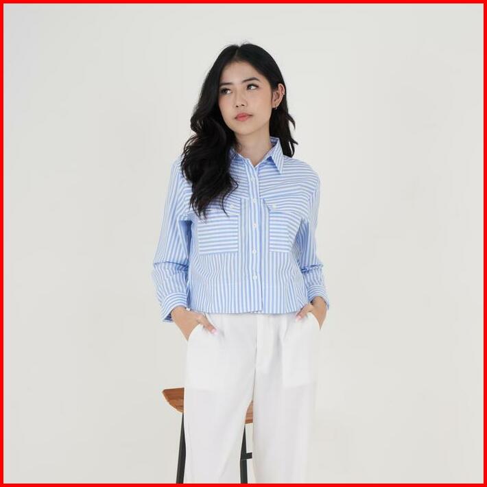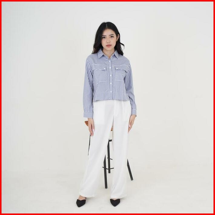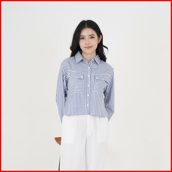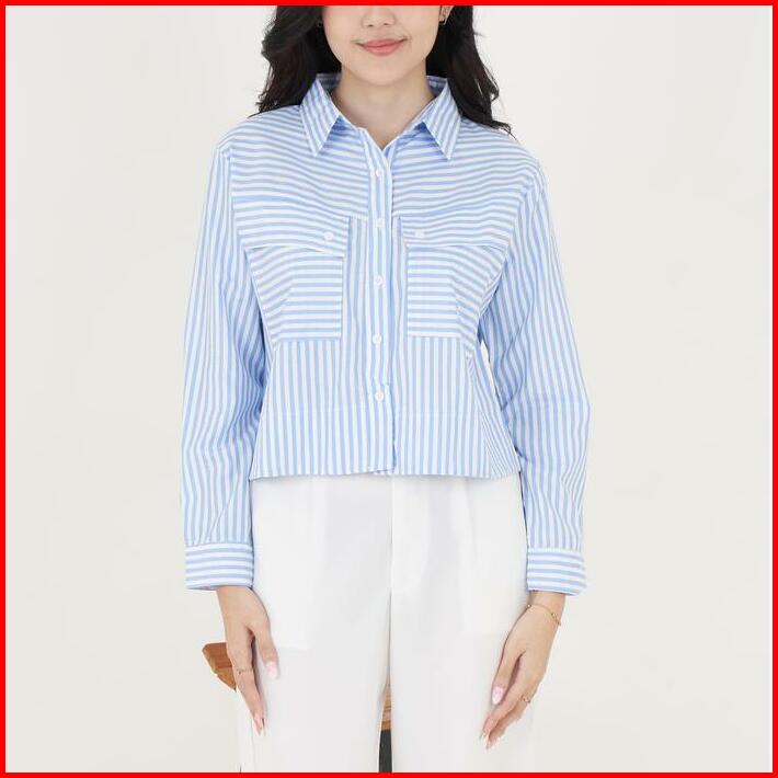 Queentin Kemeja Wanita Crop 0653 Katun Polymicro Motif Salur Lengan Panjang Casual