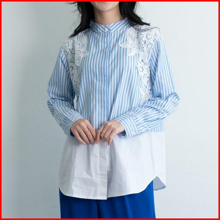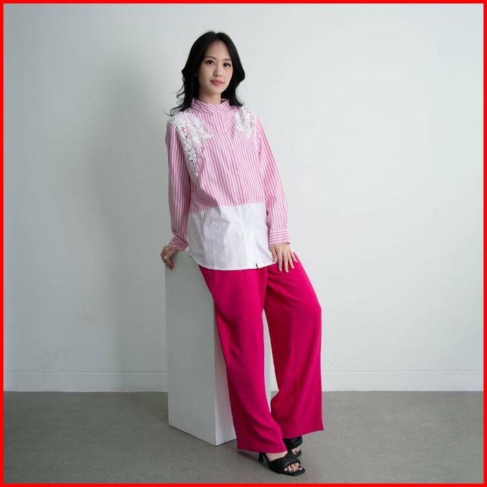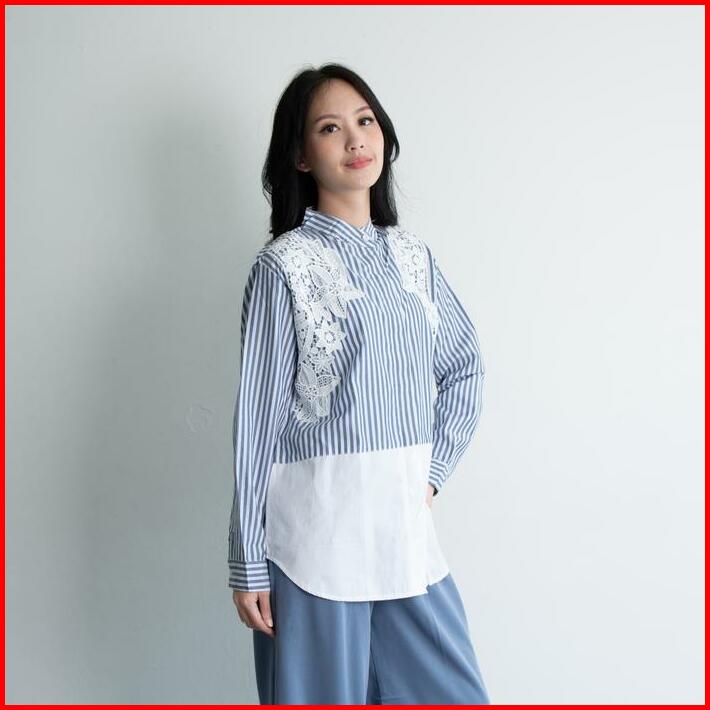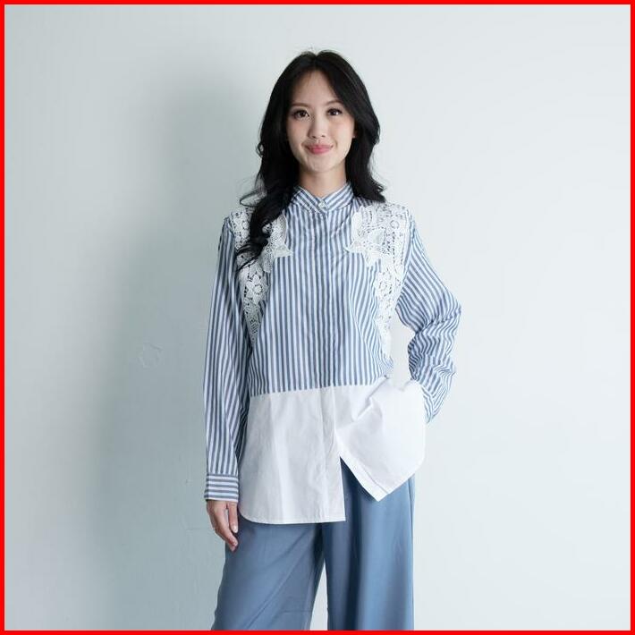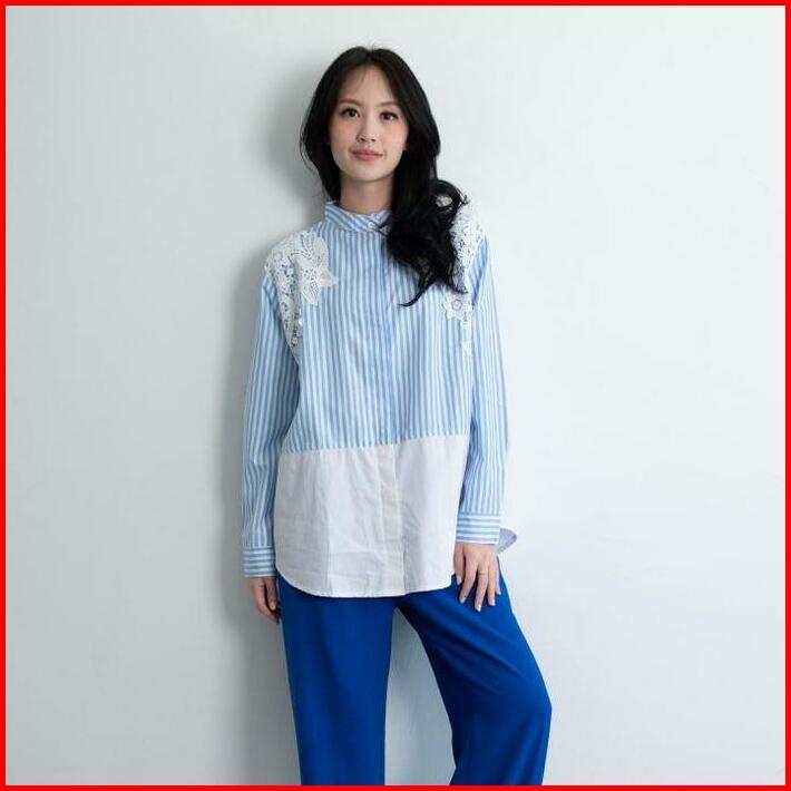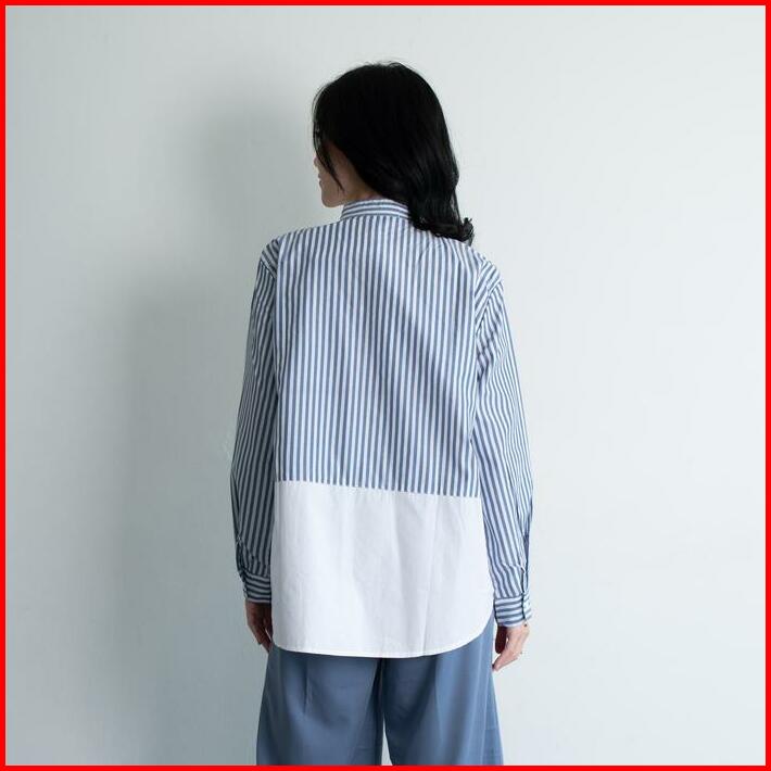 Queentin Kemeja Wanita Kombinasi 0575 Katun Polymicro Motif Salur Mix Katun Bordir Lengan Panjang Baju Kerja Wanita