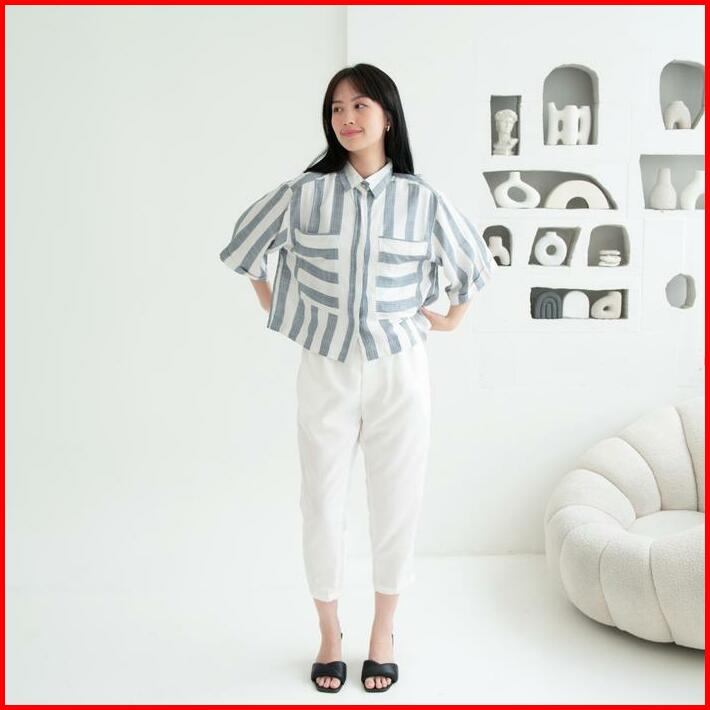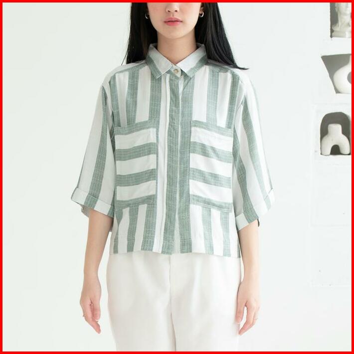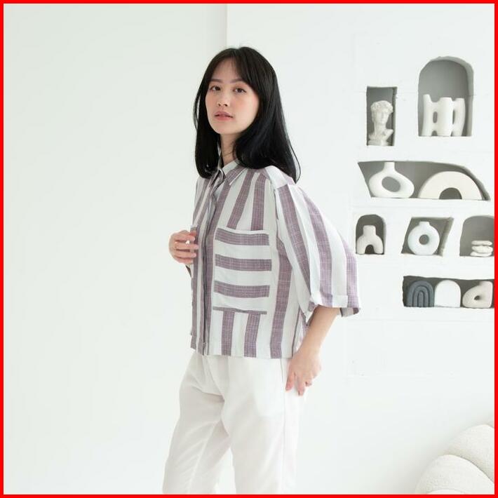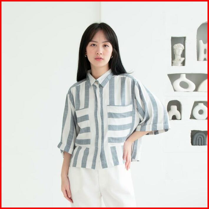 Queentin Kemeja Wanita Crop 0687 Rayon Motif Salur Lengan Siku 3 4 Atasan Garis Casual Kerja
