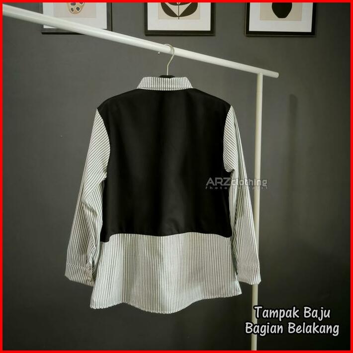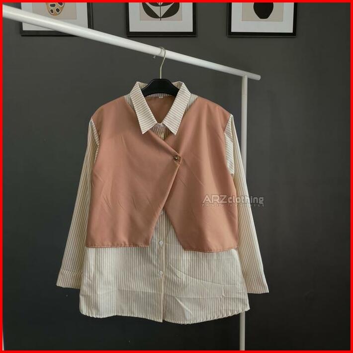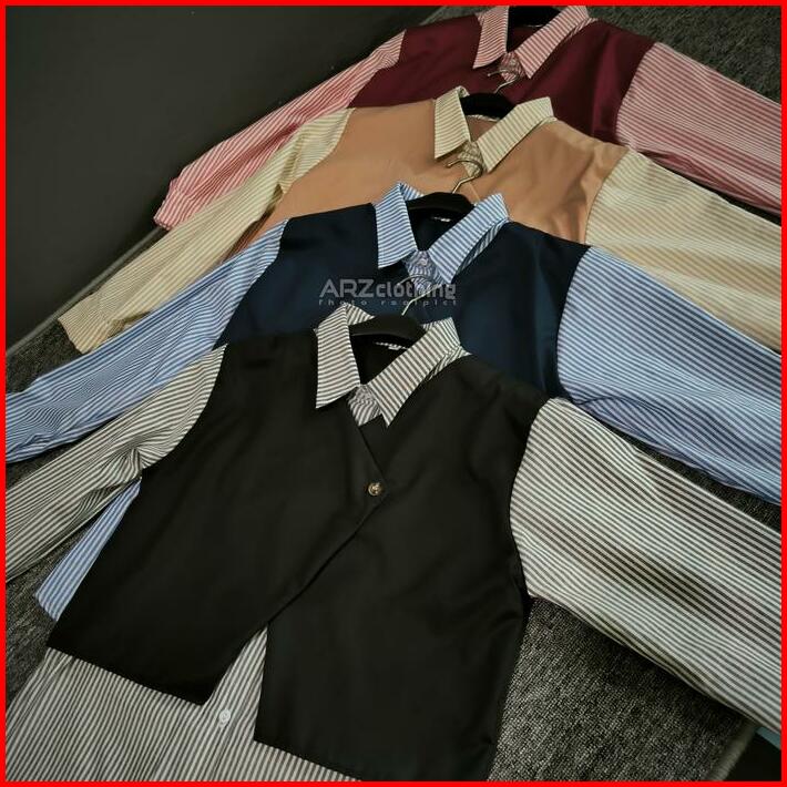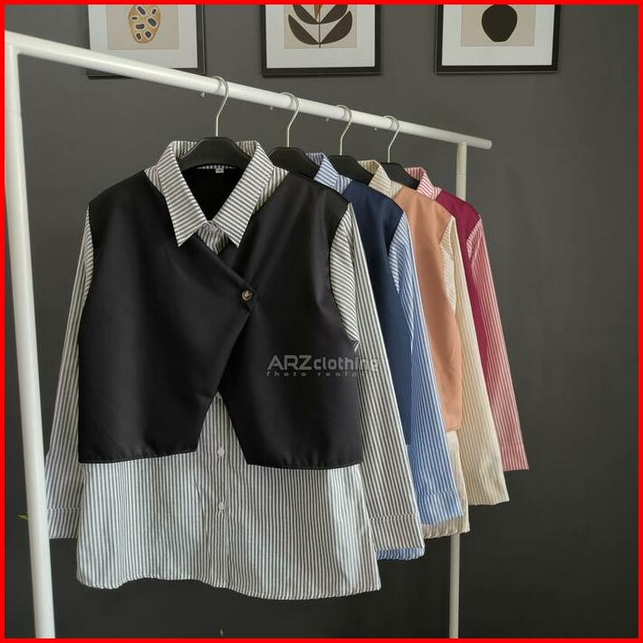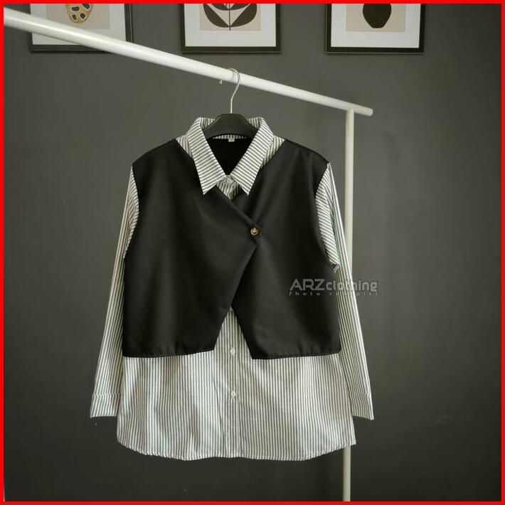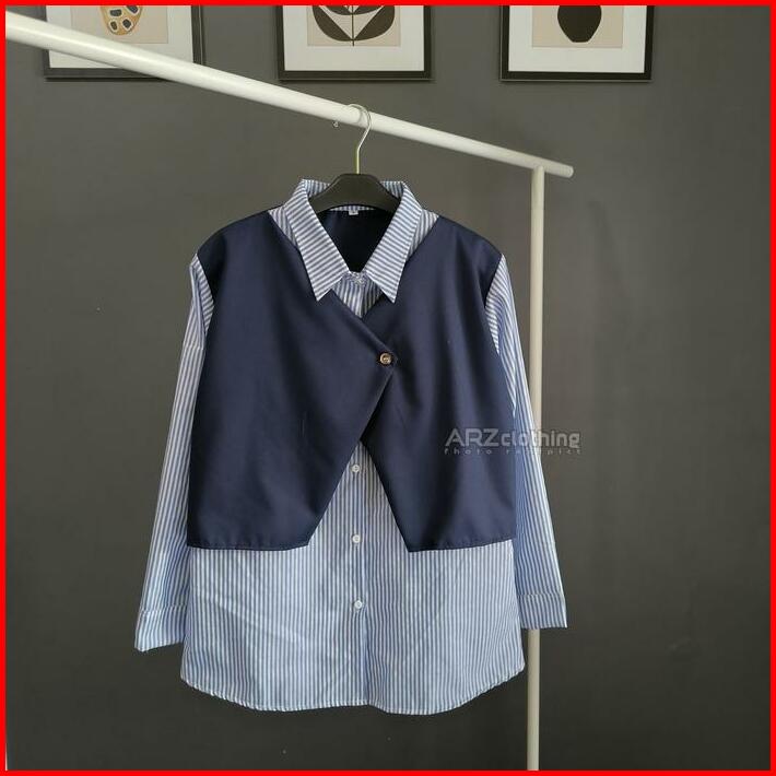 Atasan Kemeja Kombinasi Vest Salur Wanita Lengan Panjang Size M L Xl Xxl 3xl Jumbo