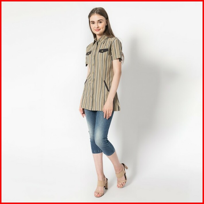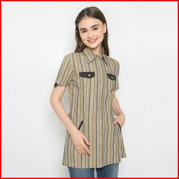 Lgs Kemeja Wanita Slim Fit Coklat Motif Salur Llsh Size
